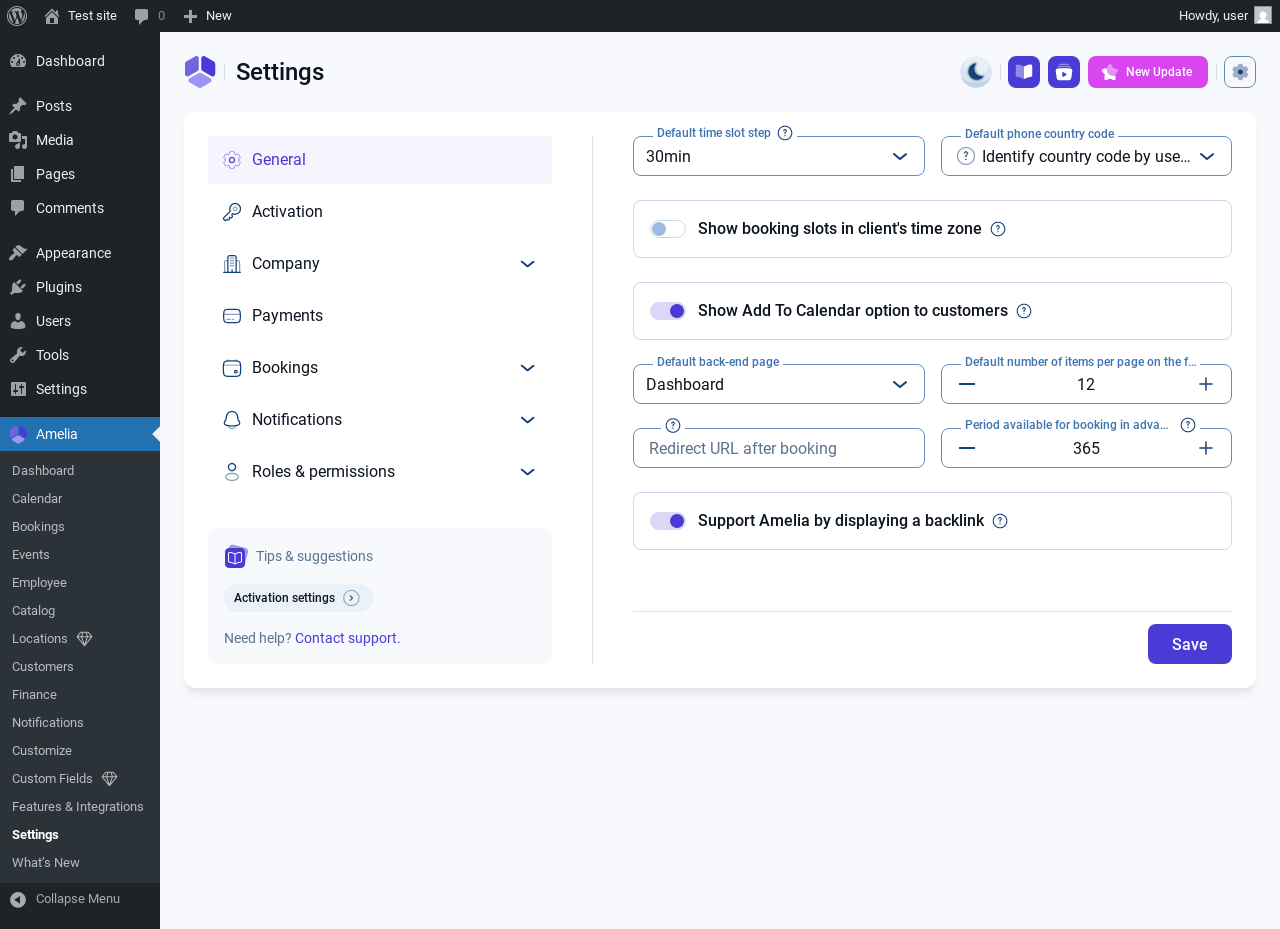 | URL | /wp-admin/admin.php?page=wpamelia-settings#/general |