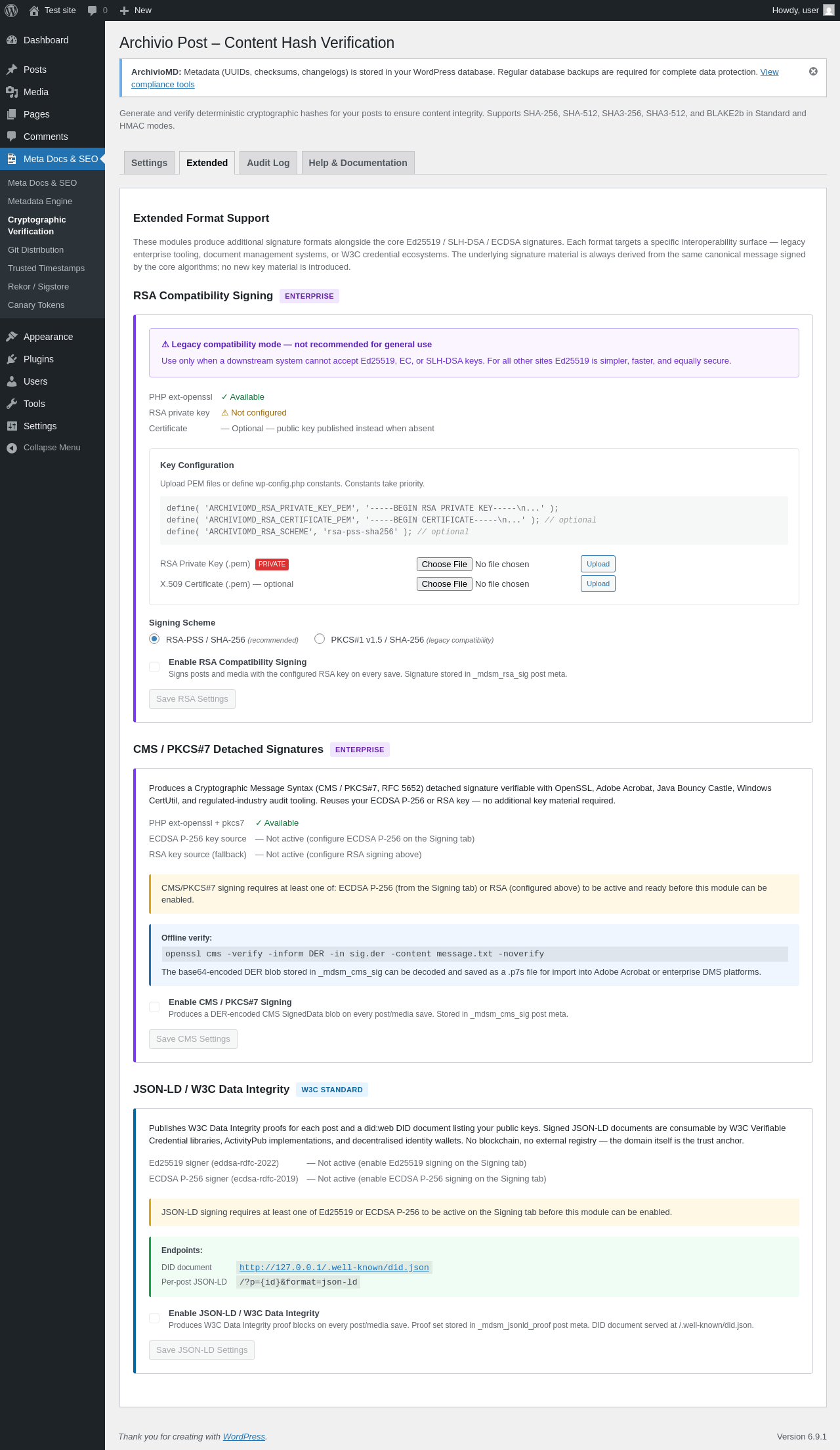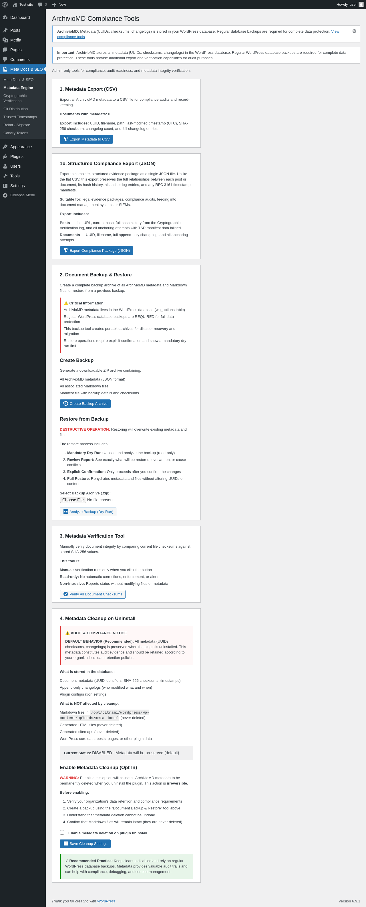 Does ArchivioMD work with WordPress 6.9.1 and PHP 8.1.12? A smoke test was performed on .