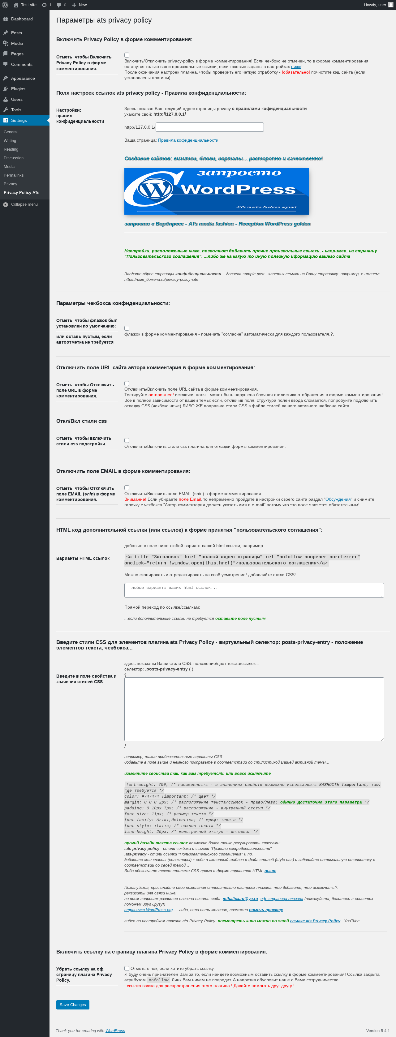 Does ats privacy policy work with WordPress 5.4.1 and PHP 7.2.16? A smoke test was performed on .