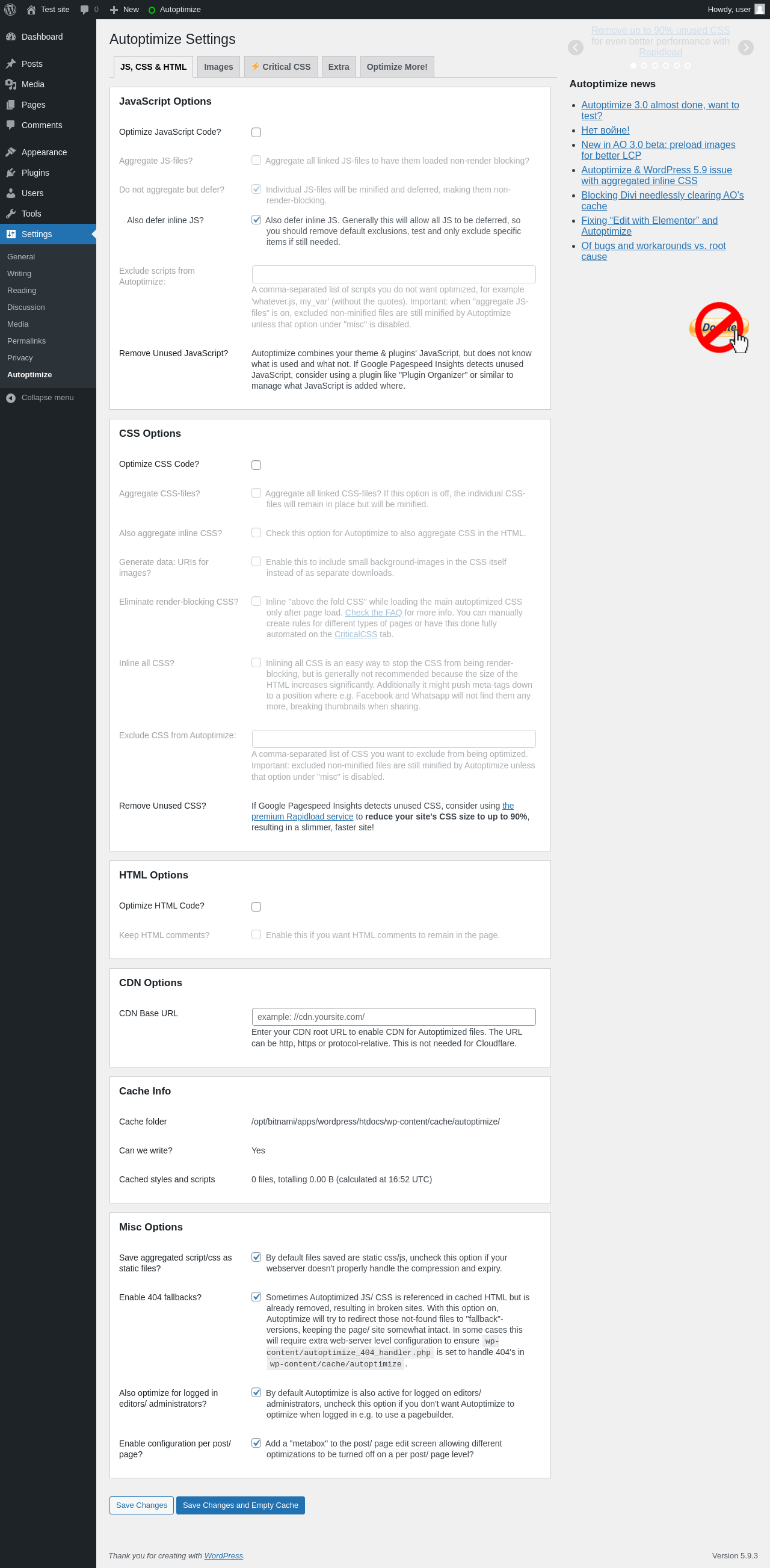 | URL | /wp-admin/options-general.php?page=autoptimize_extra |