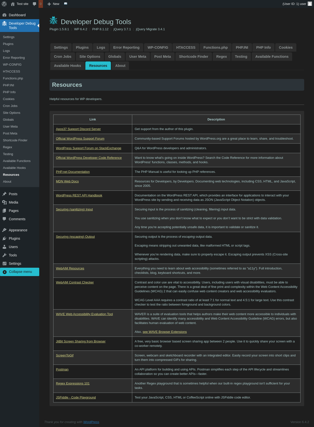 | URL | /wp-admin/admin.php?page=dev-debug-tools&tab=resources |