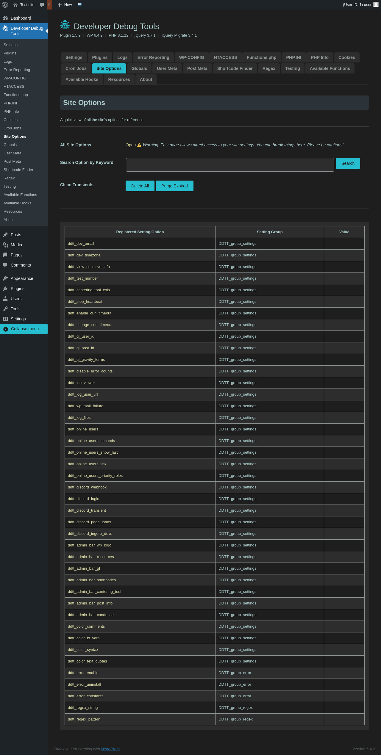| URL | /wp-admin/admin.php?page=dev-debug-tools&tab=siteoptions |