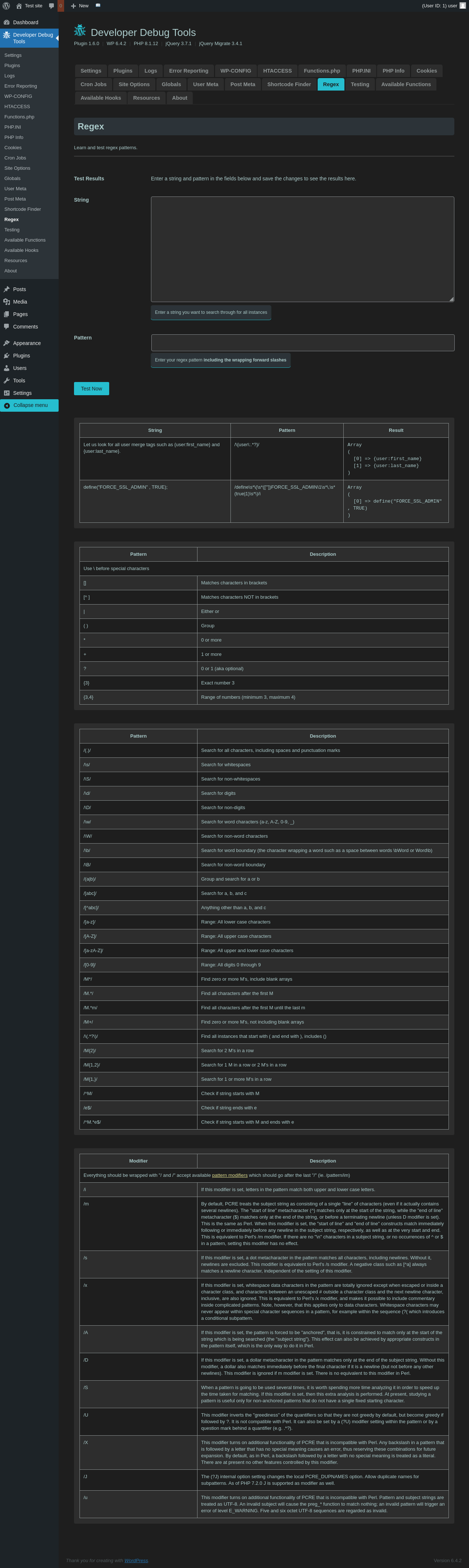 | URL | /wp-admin/admin.php?page=dev-debug-tools&tab=regex |