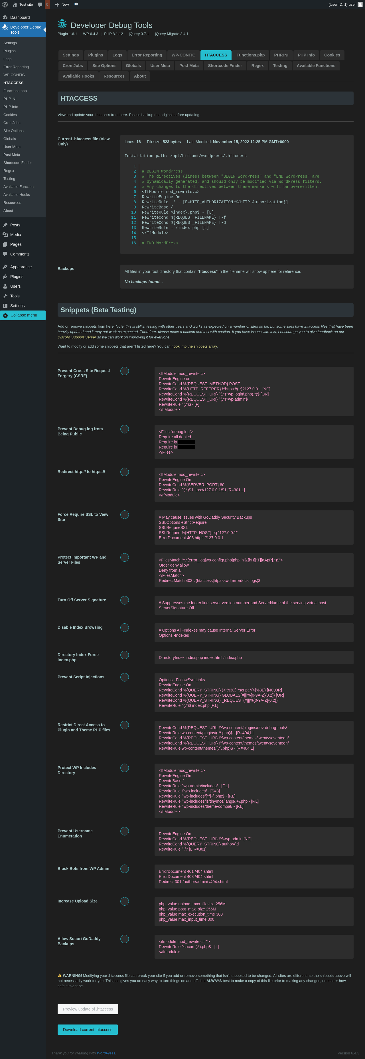 | URL | /wp-admin/admin.php?page=dev-debug-tools&tab=htaccess |