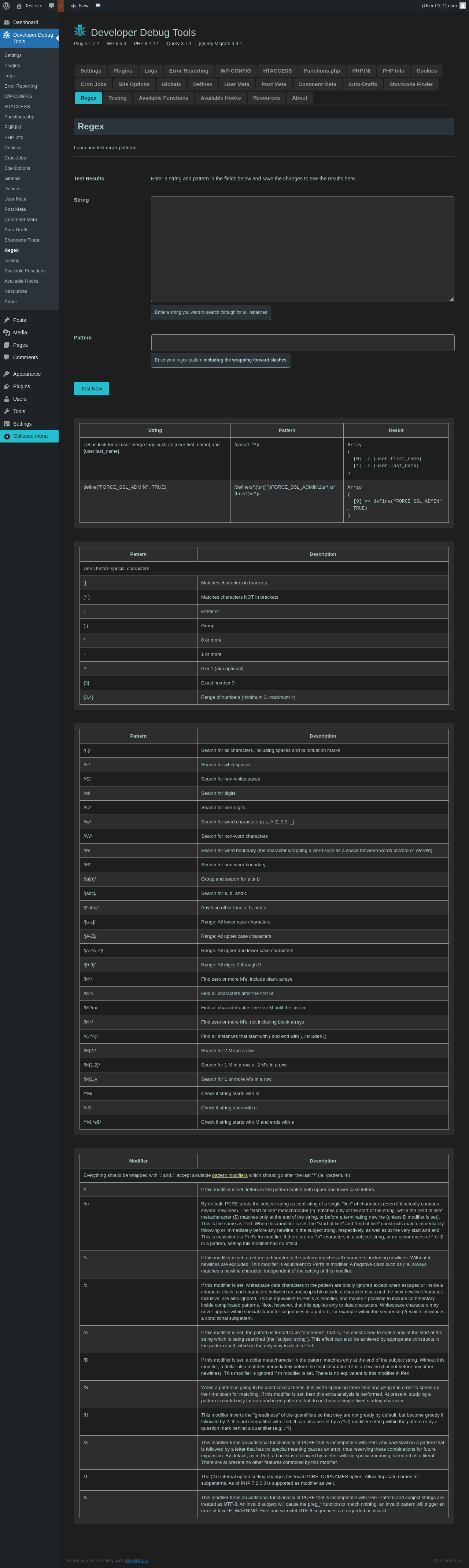 | URL | /wp-admin/admin.php?page=dev-debug-tools&tab=regex |