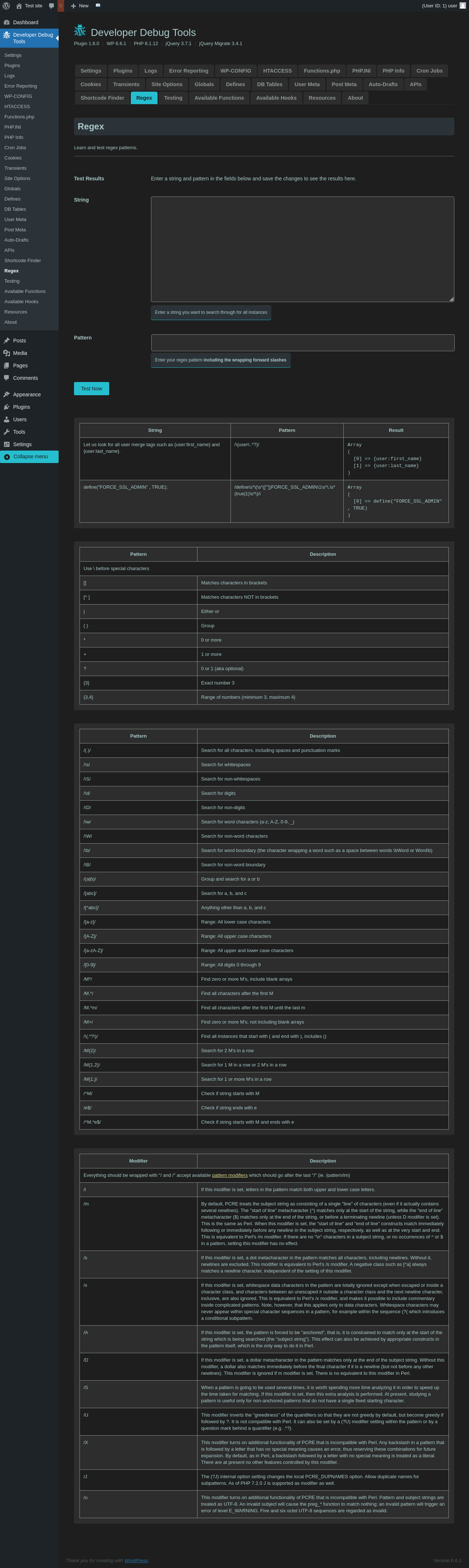 | URL | /wp-admin/admin.php?page=dev-debug-tools&tab=regex |