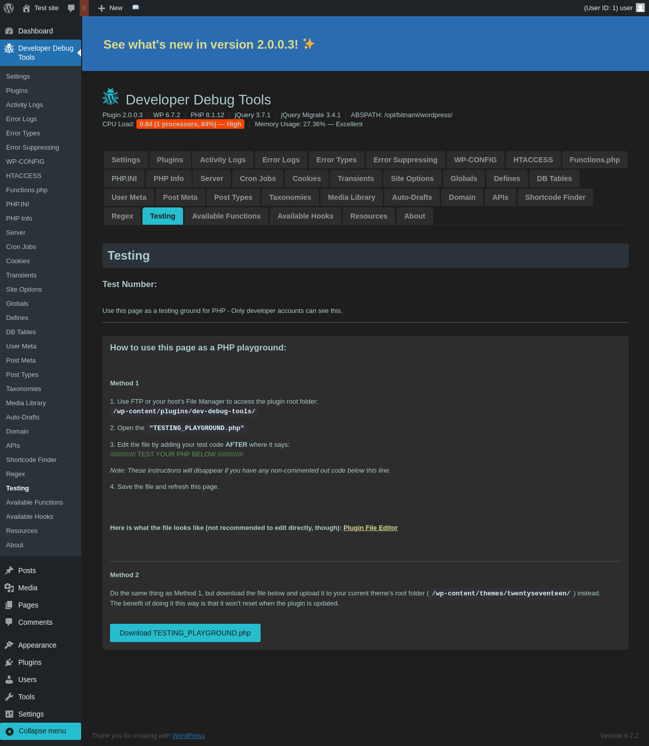 | URL | /wp-admin/admin.php?page=dev-debug-tools&tab=testing |