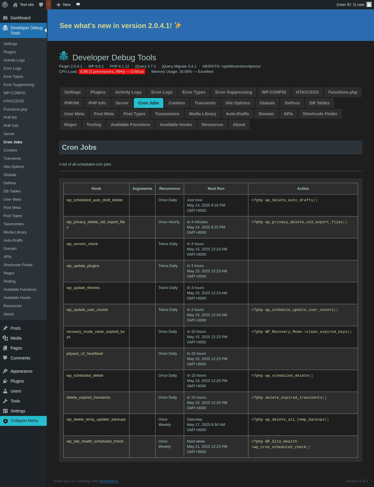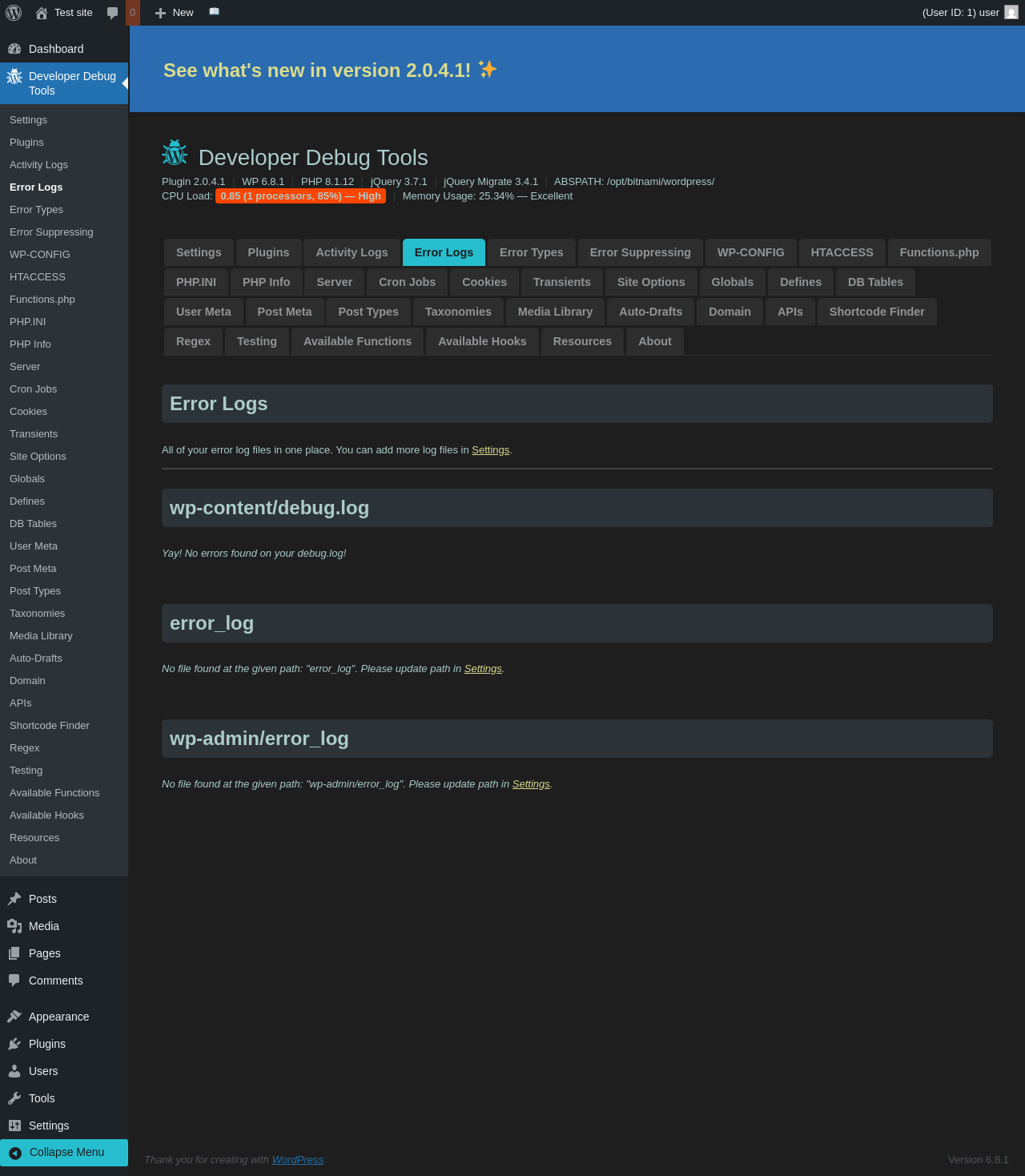 Does Developer Debug Tools work with WordPress 6.8.1 and PHP 8.1.12? A smoke test was performed on .