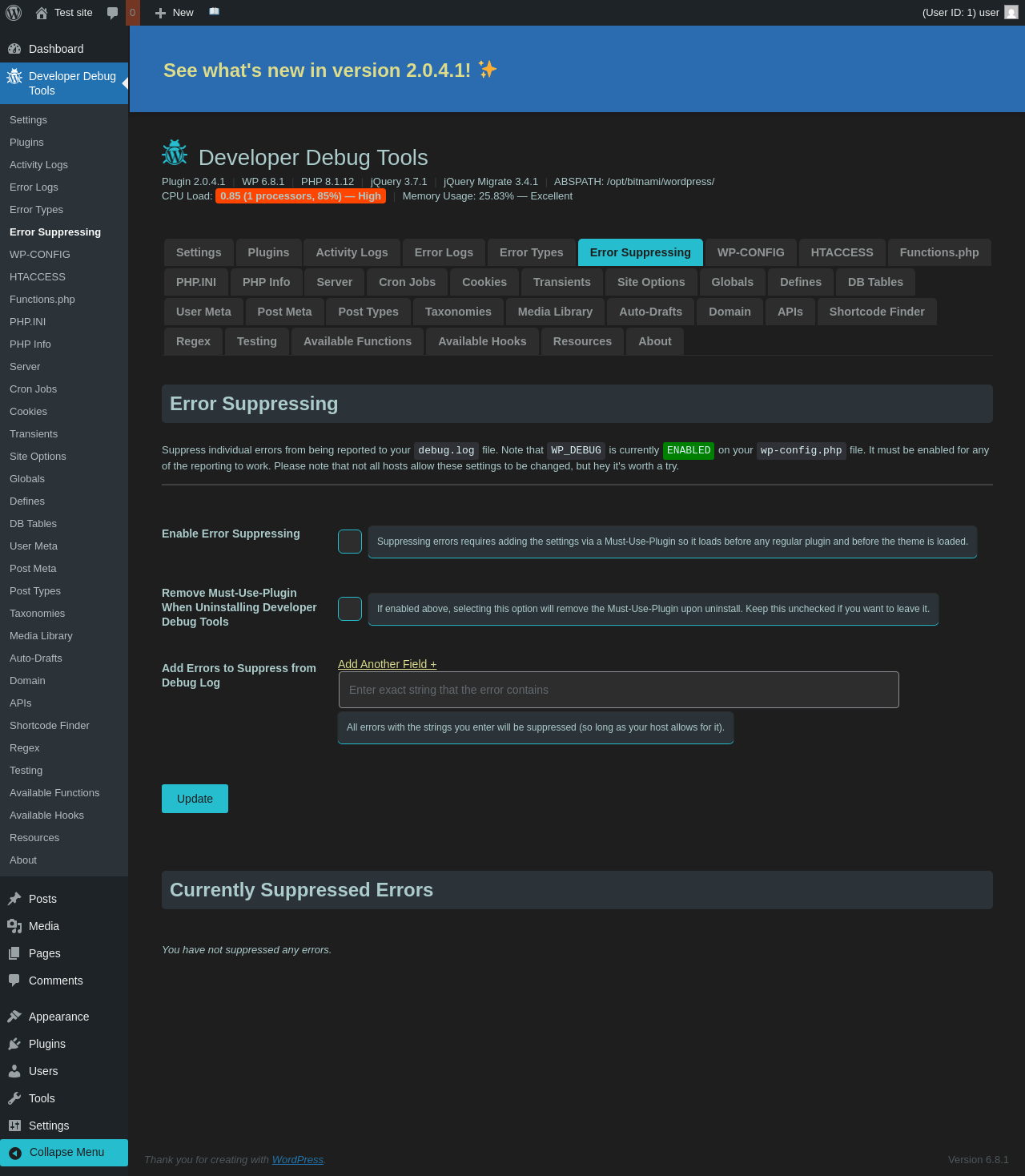 | URL | /wp-admin/admin.php?page=dev-debug-tools&tab=error-suppressing |