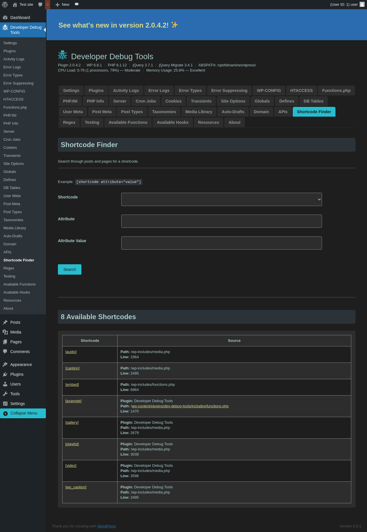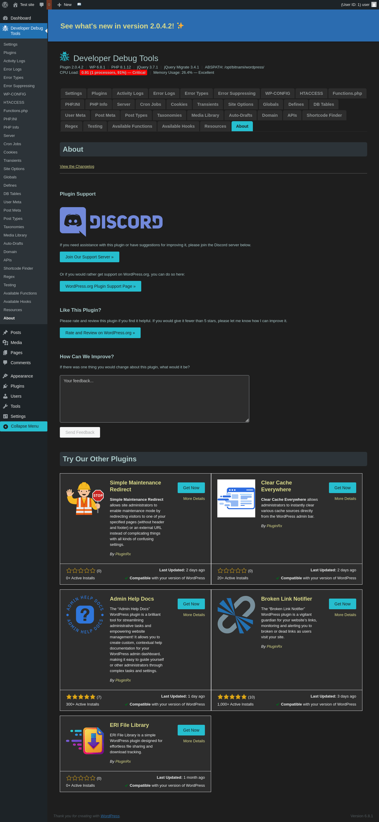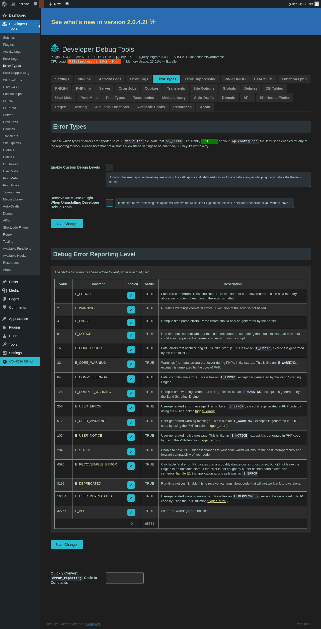 Does Developer Debug Tools work with WordPress 6.8.1 and PHP 8.1.12? A smoke test was performed on .