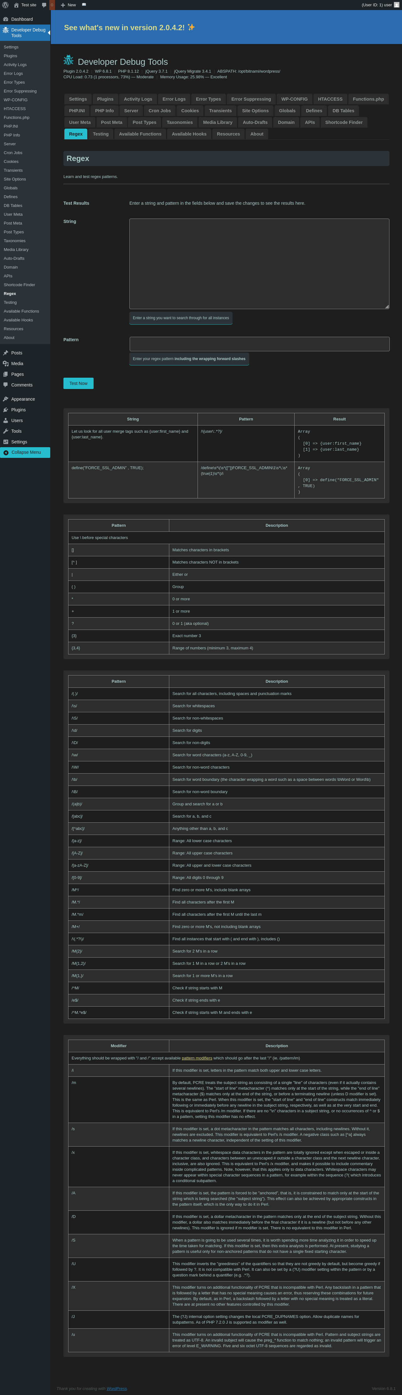 | URL | /wp-admin/admin.php?page=dev-debug-tools&tab=regex |