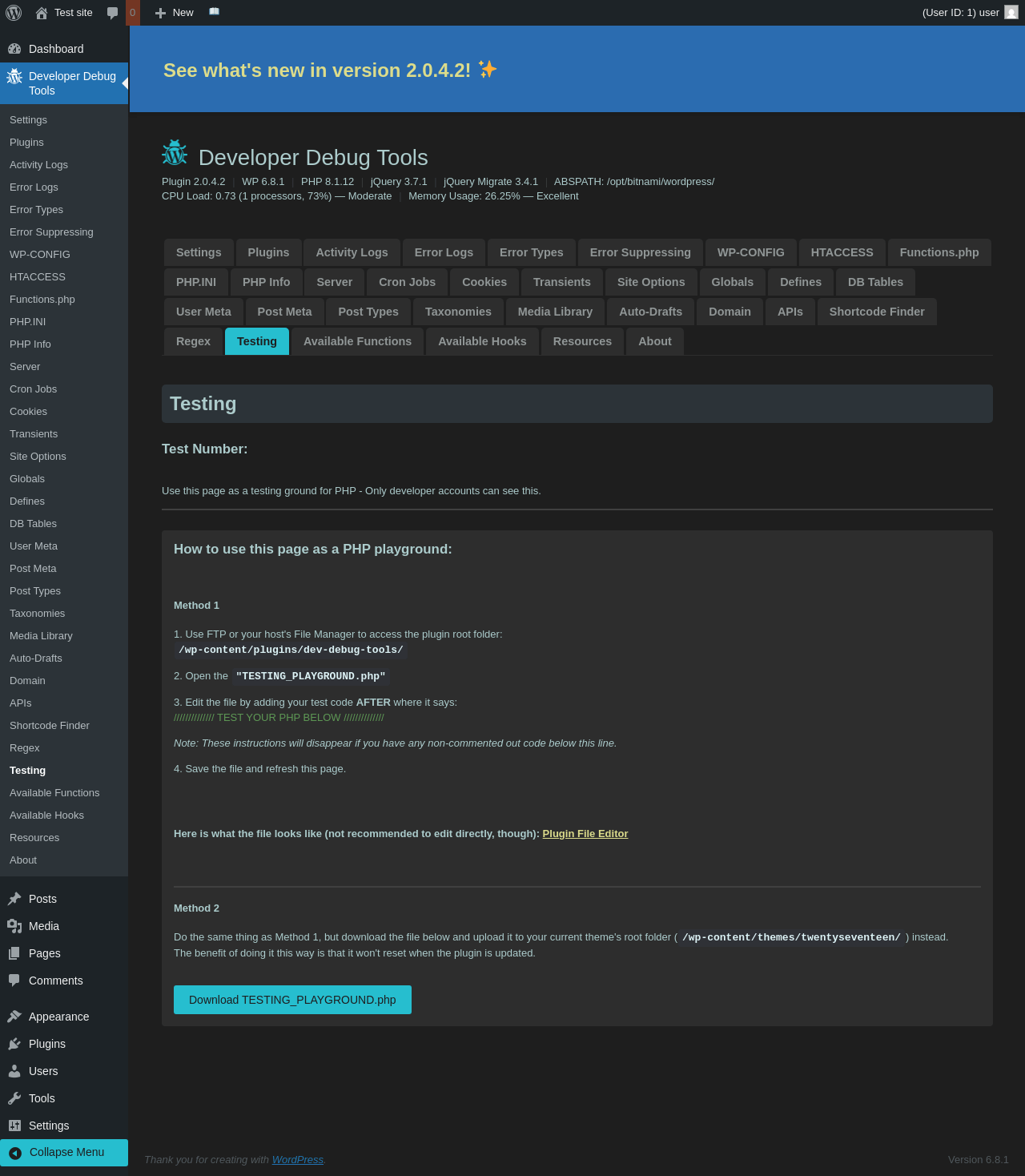 | URL | /wp-admin/admin.php?page=dev-debug-tools&tab=testing |