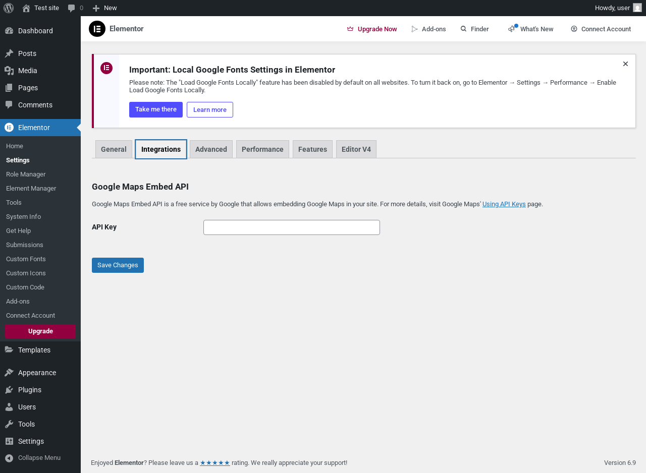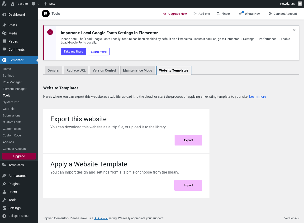 Page screenshot: Dashboard ‹ Test site — WordPress
