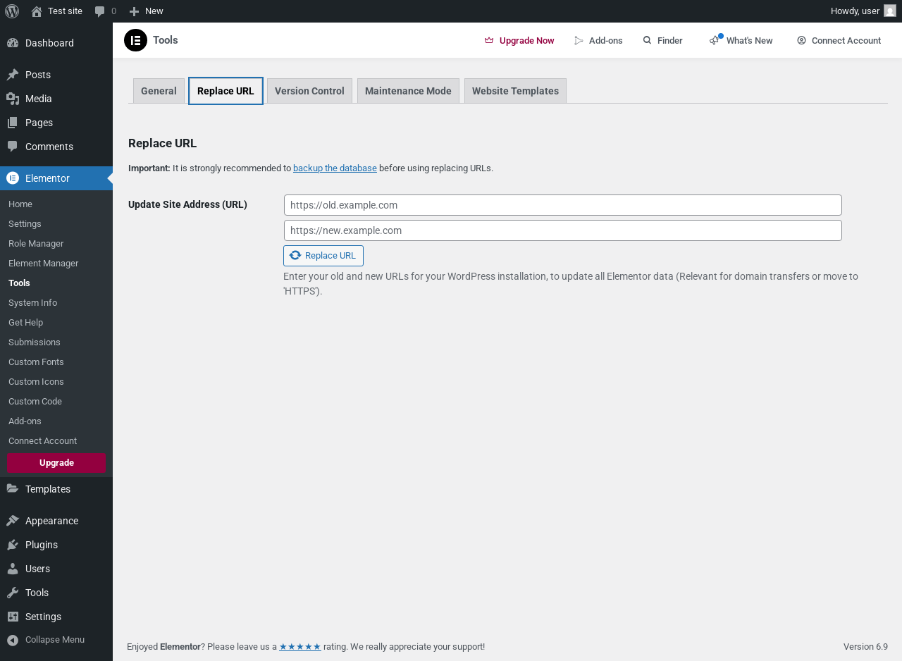 Page screenshot: Elementor → Tools → Replace URL