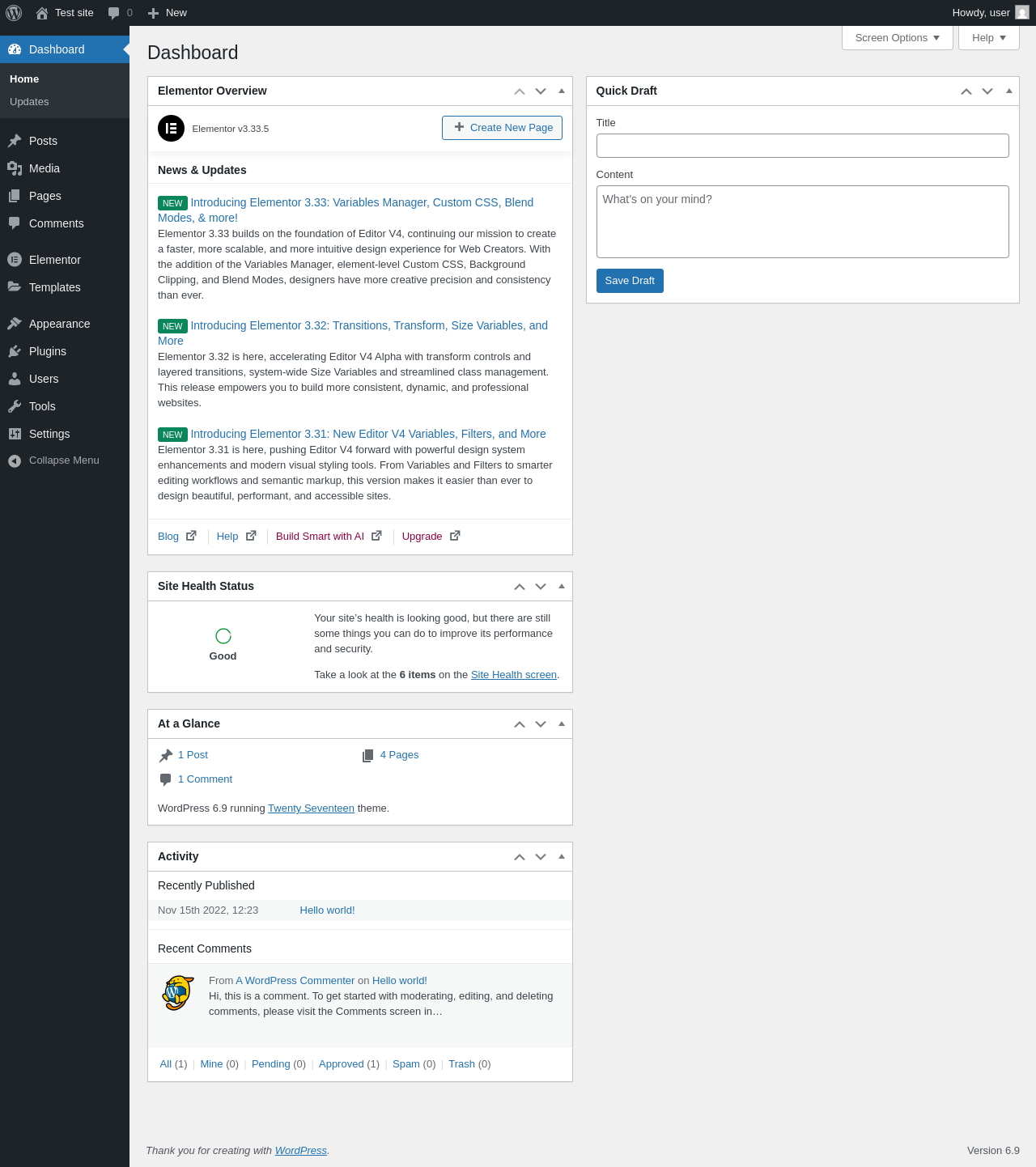 Page screenshot: Dashboard ‹ Test site — WordPress