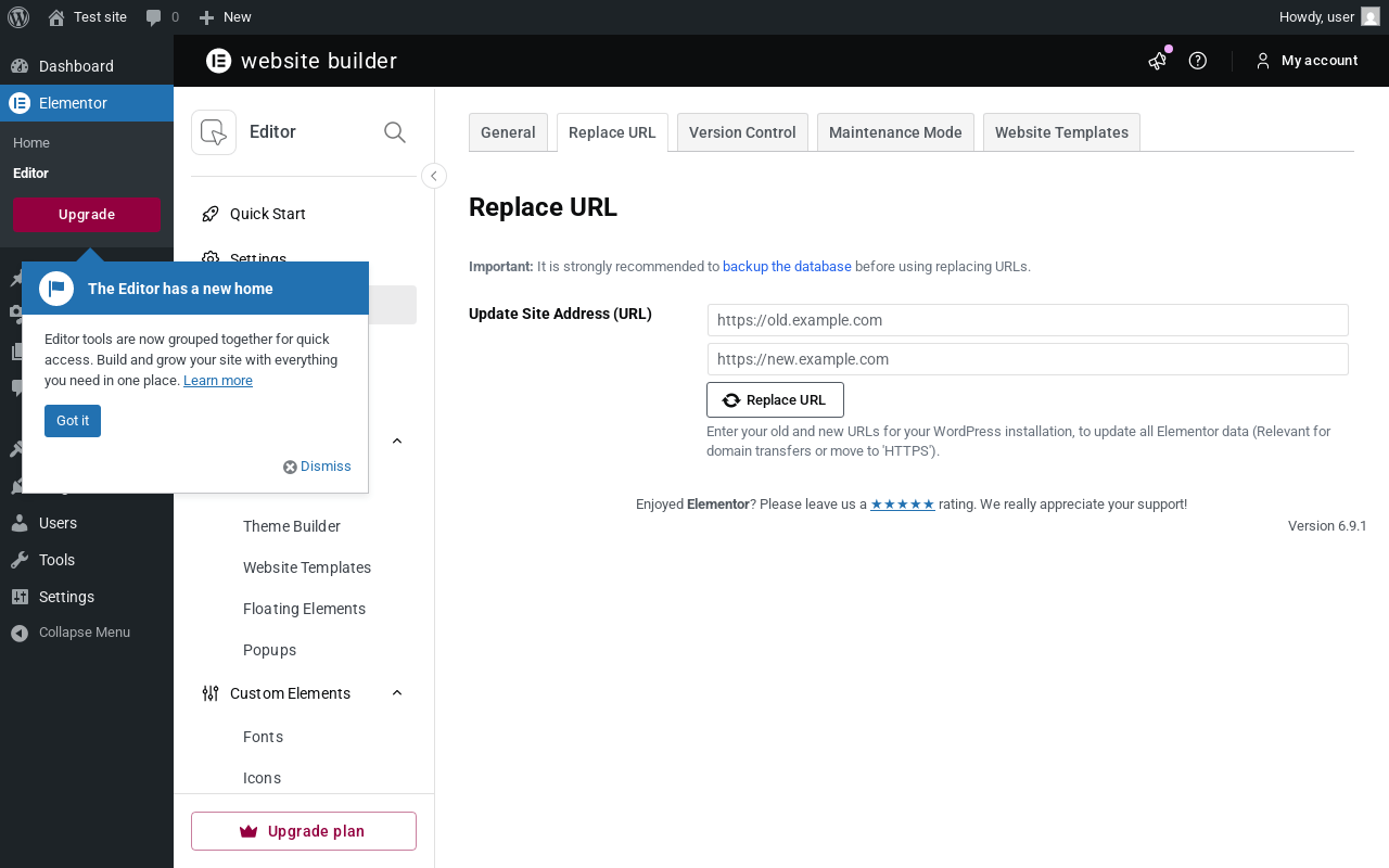Page screenshot: Elementor → Editor → Tools → Replace URL