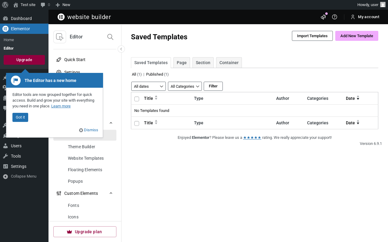 Page screenshot: Elementor → Editor → Tools → Website Templates