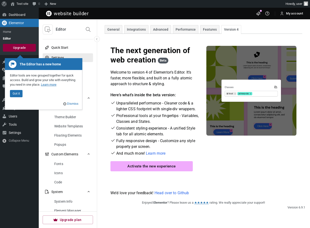 Page screenshot: Elementor → Editor → Settings → Version 4