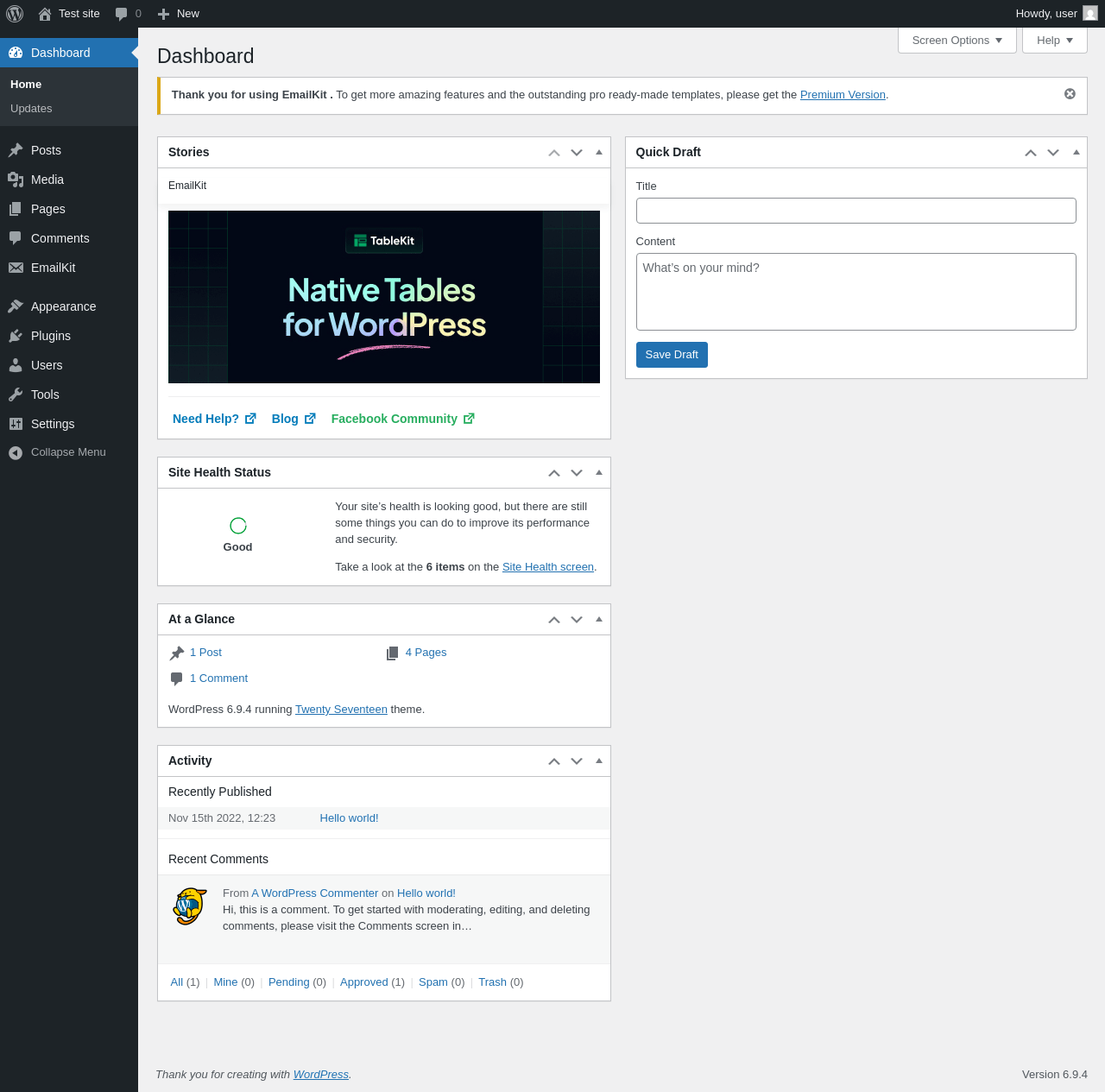 Does EmailKit work with WordPress 6.9.4 and PHP 8.1.12? A smoke test was performed on .
