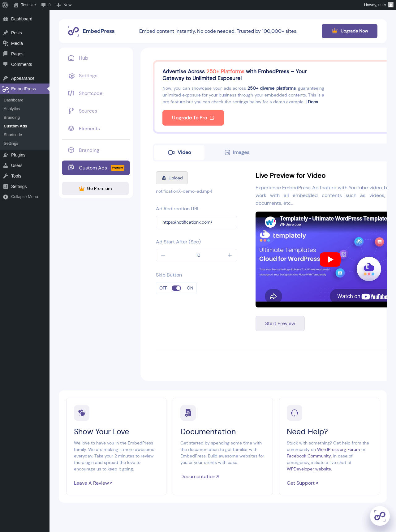 | URL | /wp-admin/admin.php?page=embedpress&page_type=ads |