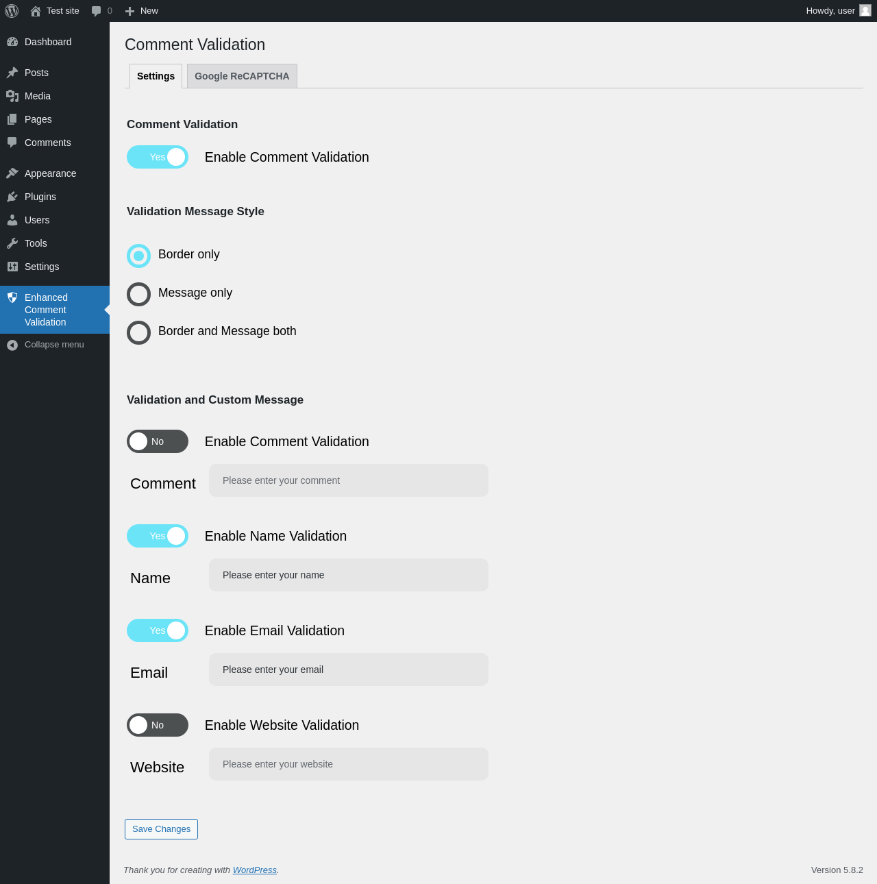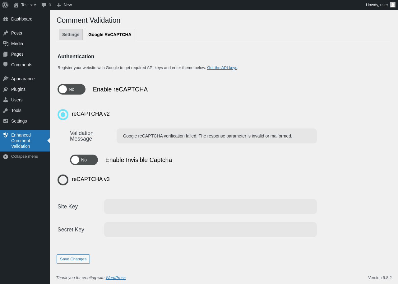 | URL | /wp-admin/admin.php?page=enhanced-comment-validation&tab=google_captcha |