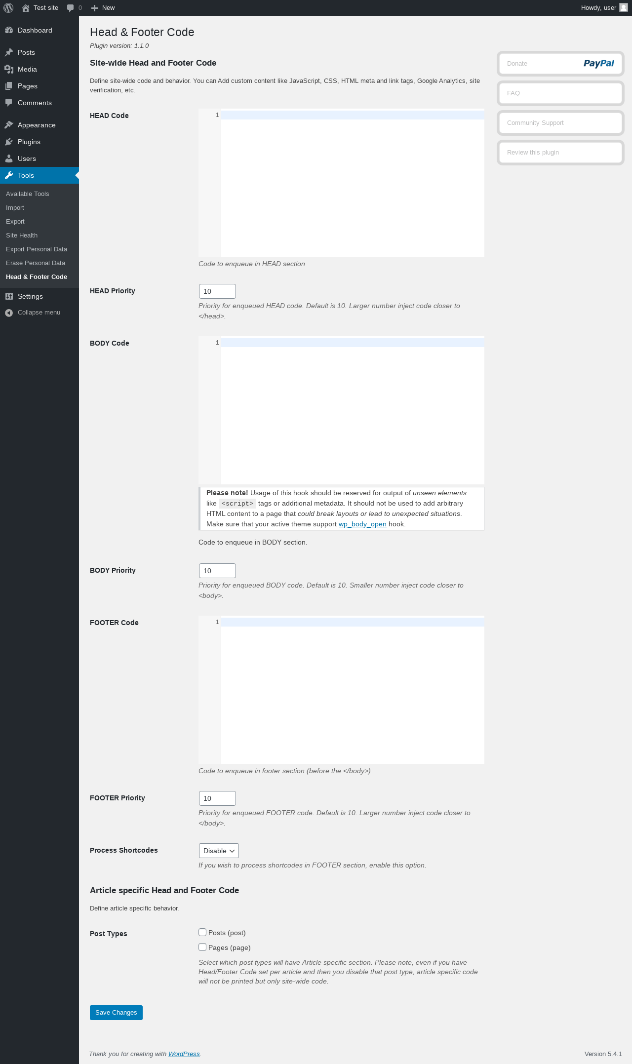 Does Head & Footer Code work with WordPress 5.4.1 and PHP 7.2.16? A smoke test was performed on .