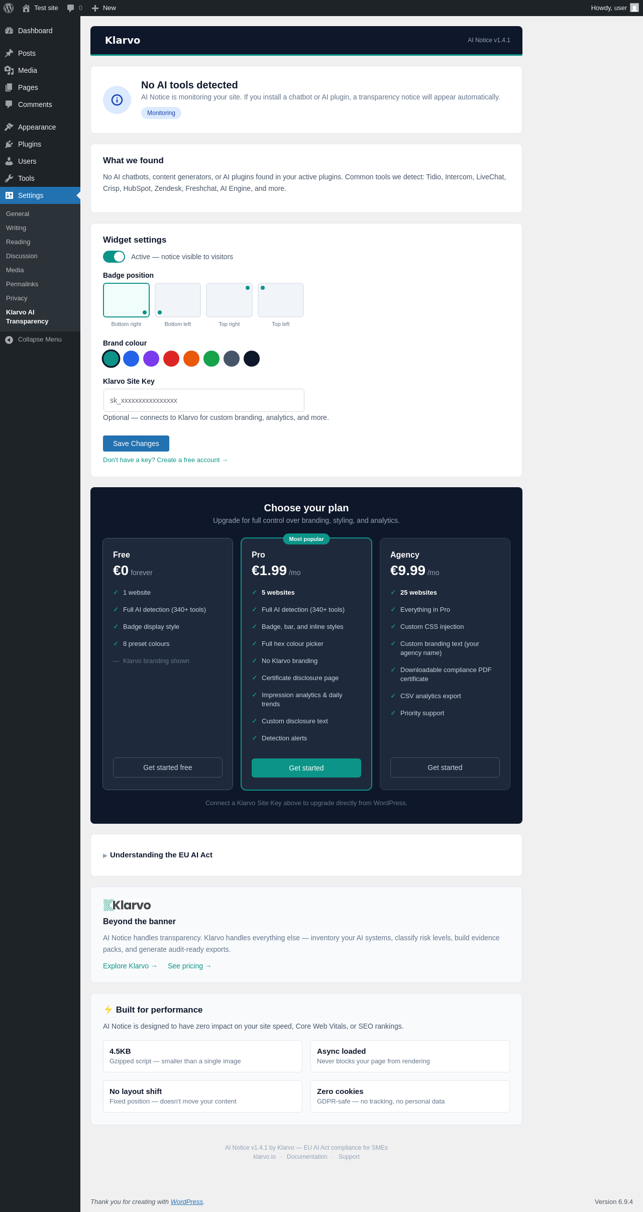 | URL | /wp-admin/options-general.php?page=klarvo-ai-transparency |
