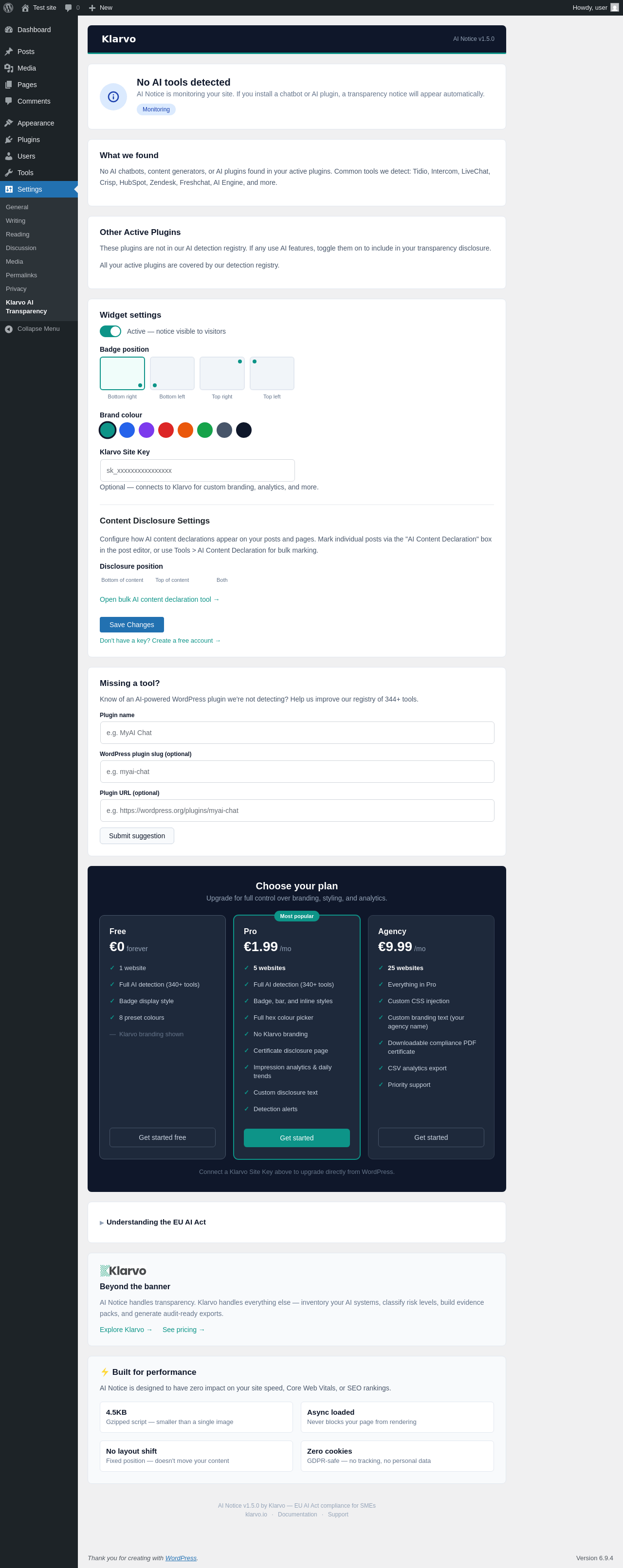 | URL | /wp-admin/options-general.php?page=klarvo-ai-transparency |