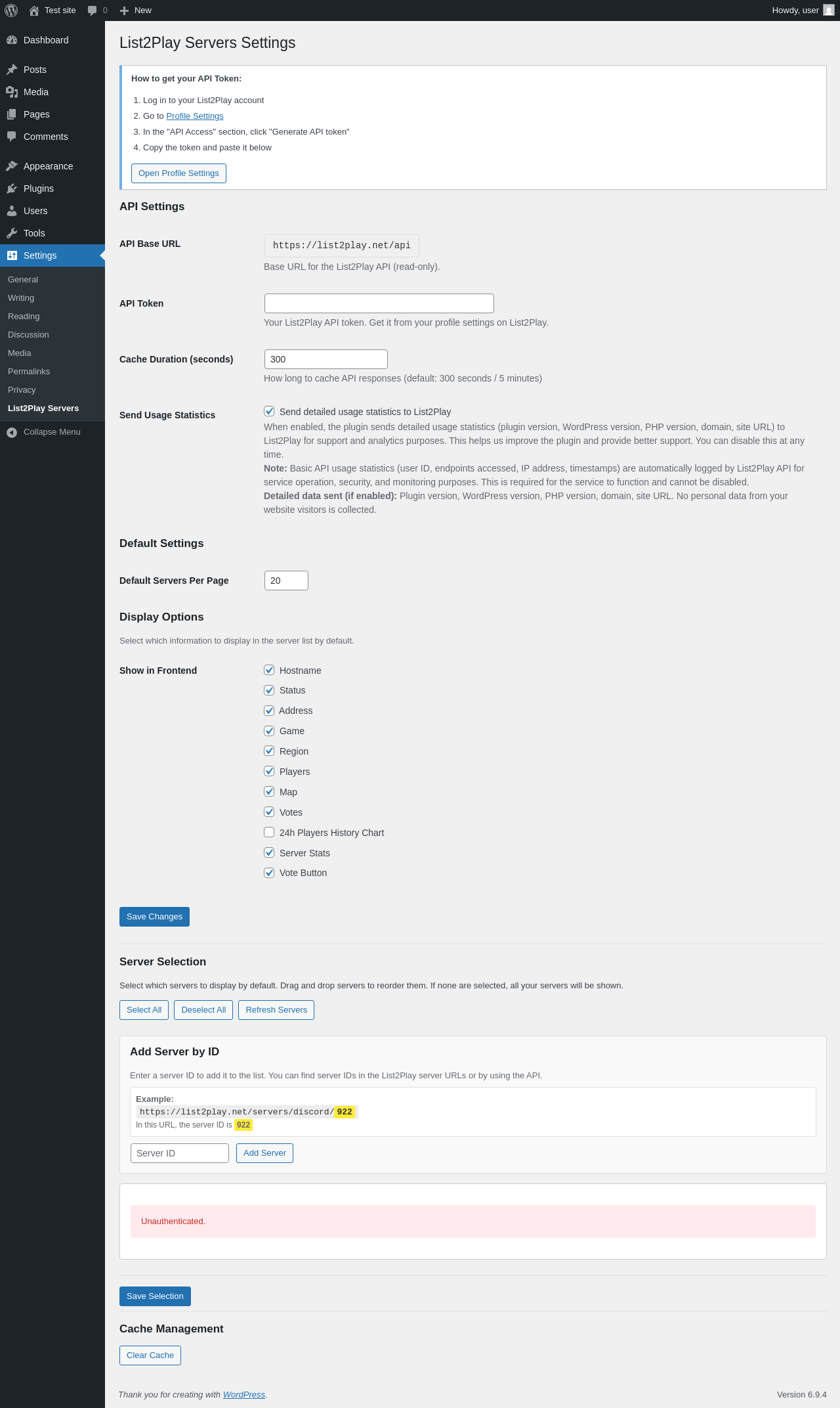 | URL | /wp-admin/options-general.php?page=list2play-servers |