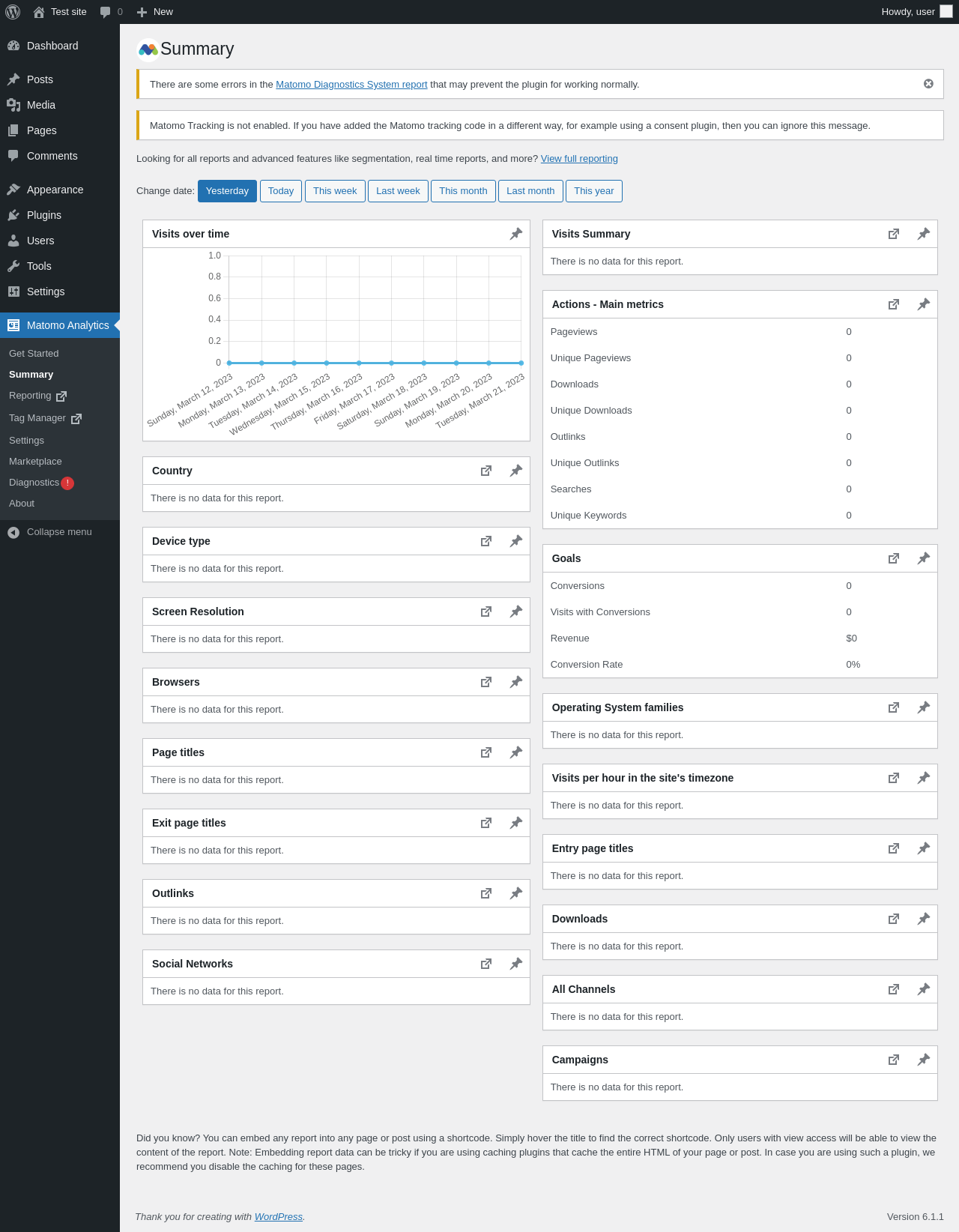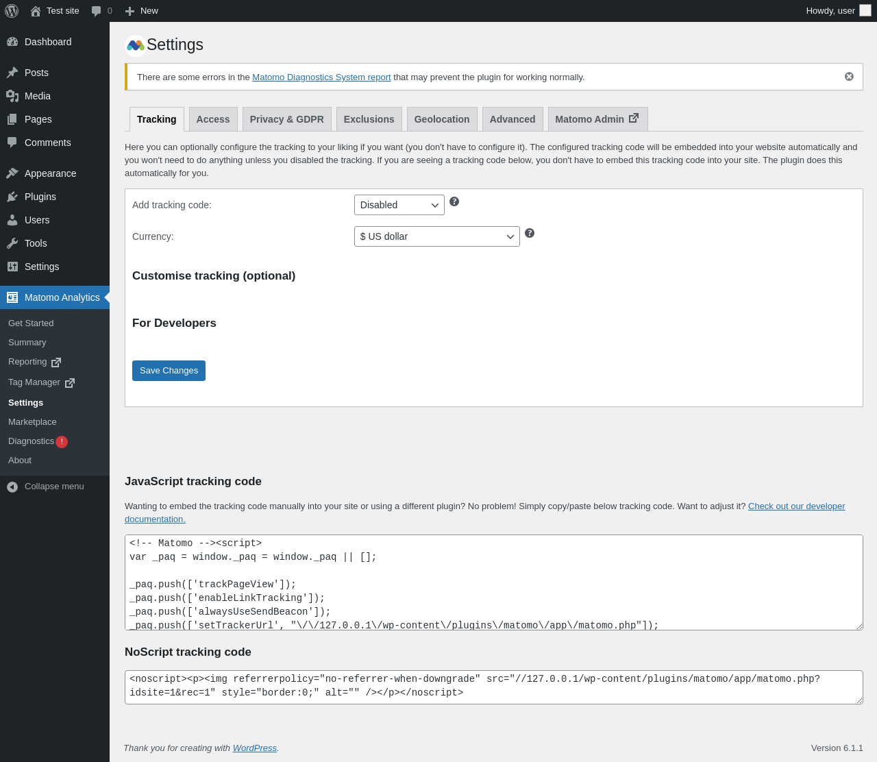 Page screenshot: Matomo Analytics → Diagnostics → Troubleshooting