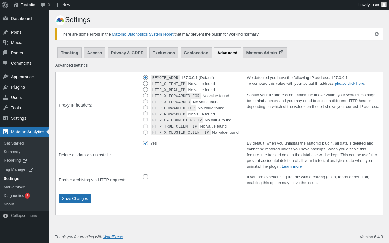 Page screenshot: Matomo Analytics → Diagnostics → Troubleshooting