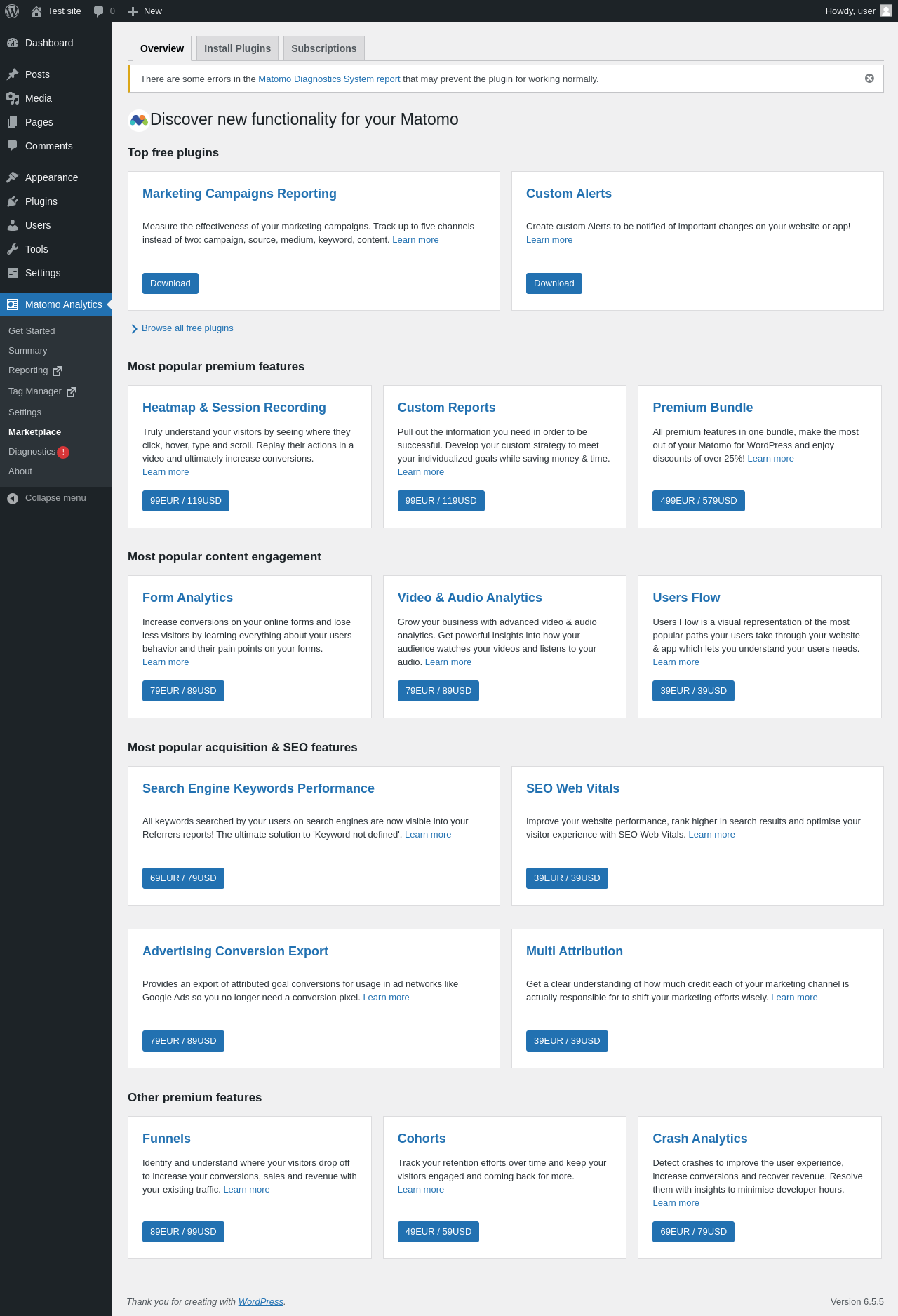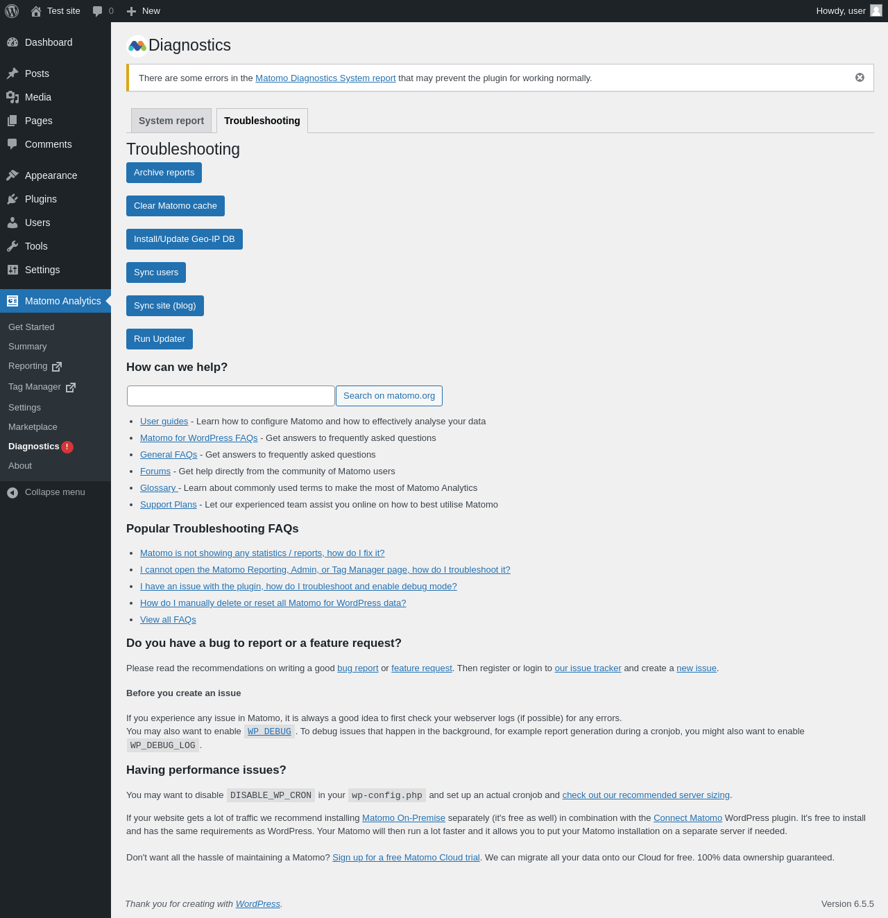 Page screenshot: Matomo Analytics → Diagnostics → Troubleshooting