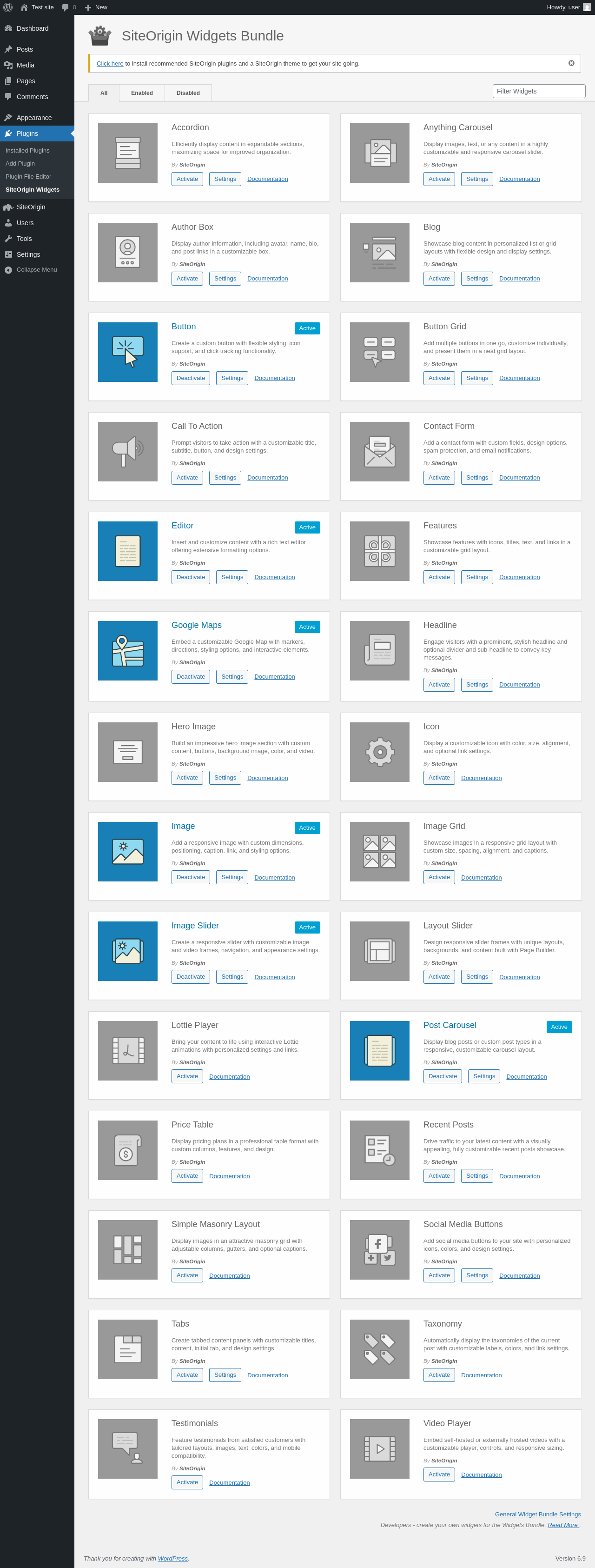 Does SiteOrigin Widgets Bundle work with WordPress 6.9 and PHP 8.1.12? A smoke test was performed on .