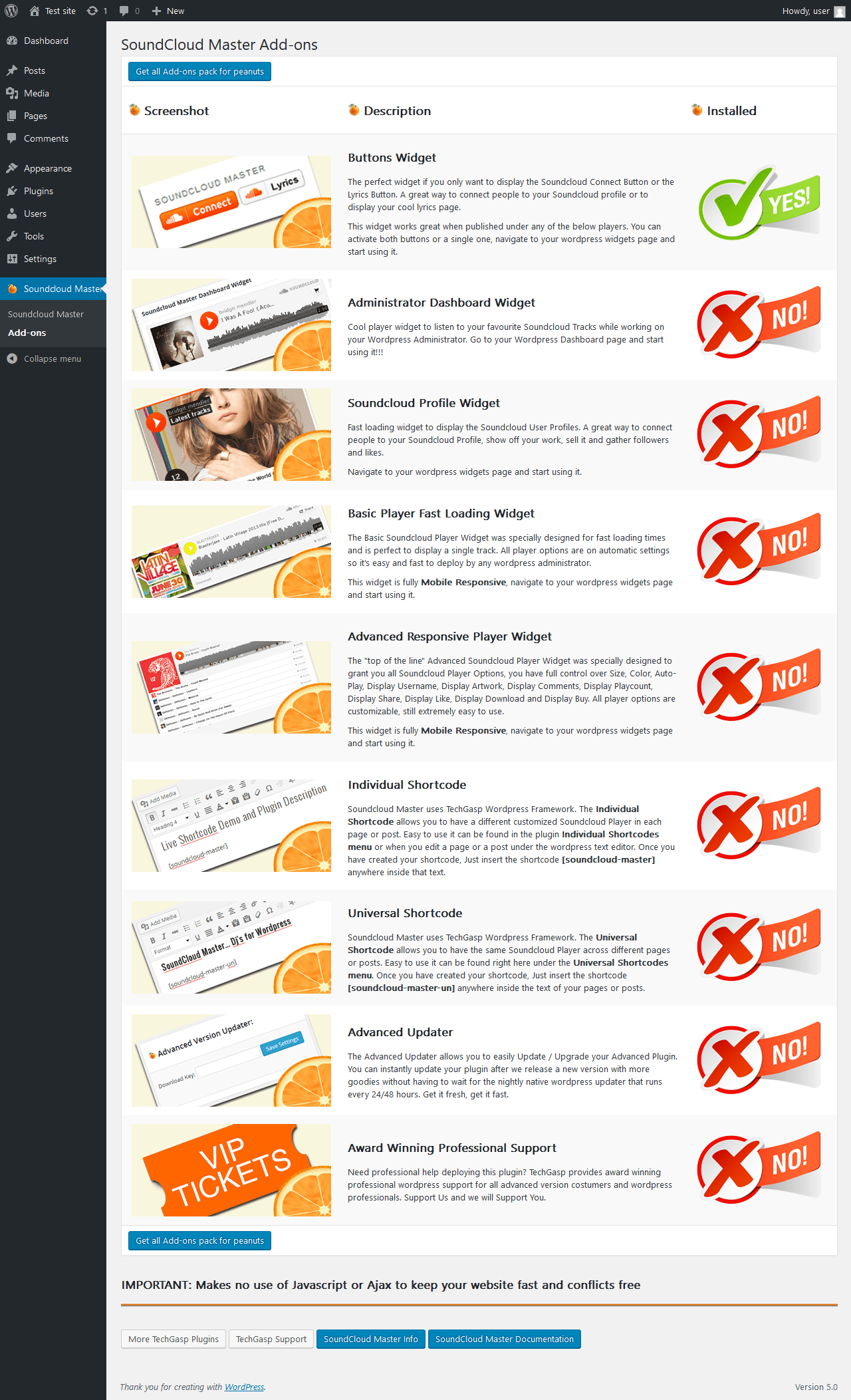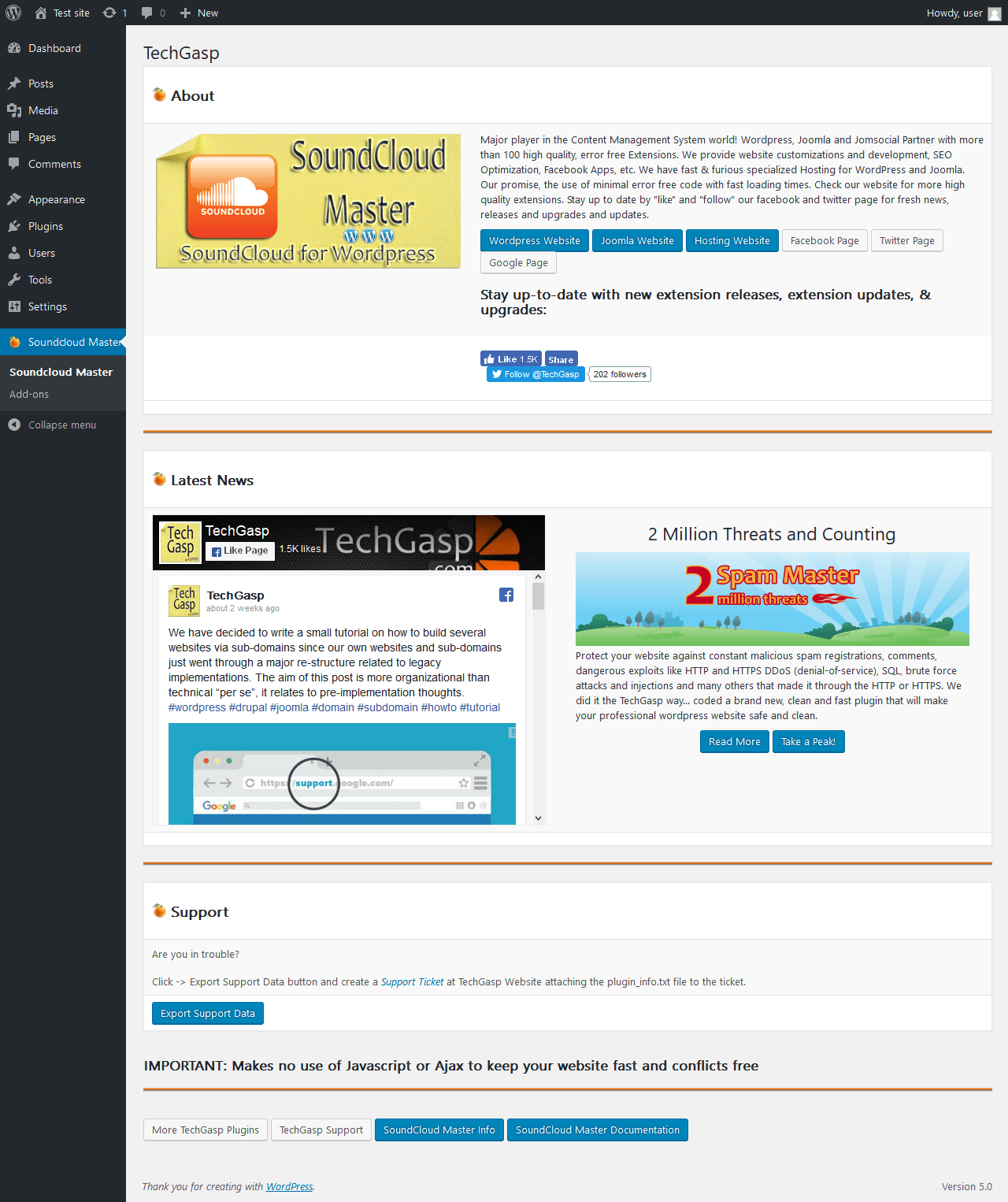 Does TechGasp SoundCloud Master work with WordPress 5.0 and PHP 7.0.16? A smoke test was performed on .