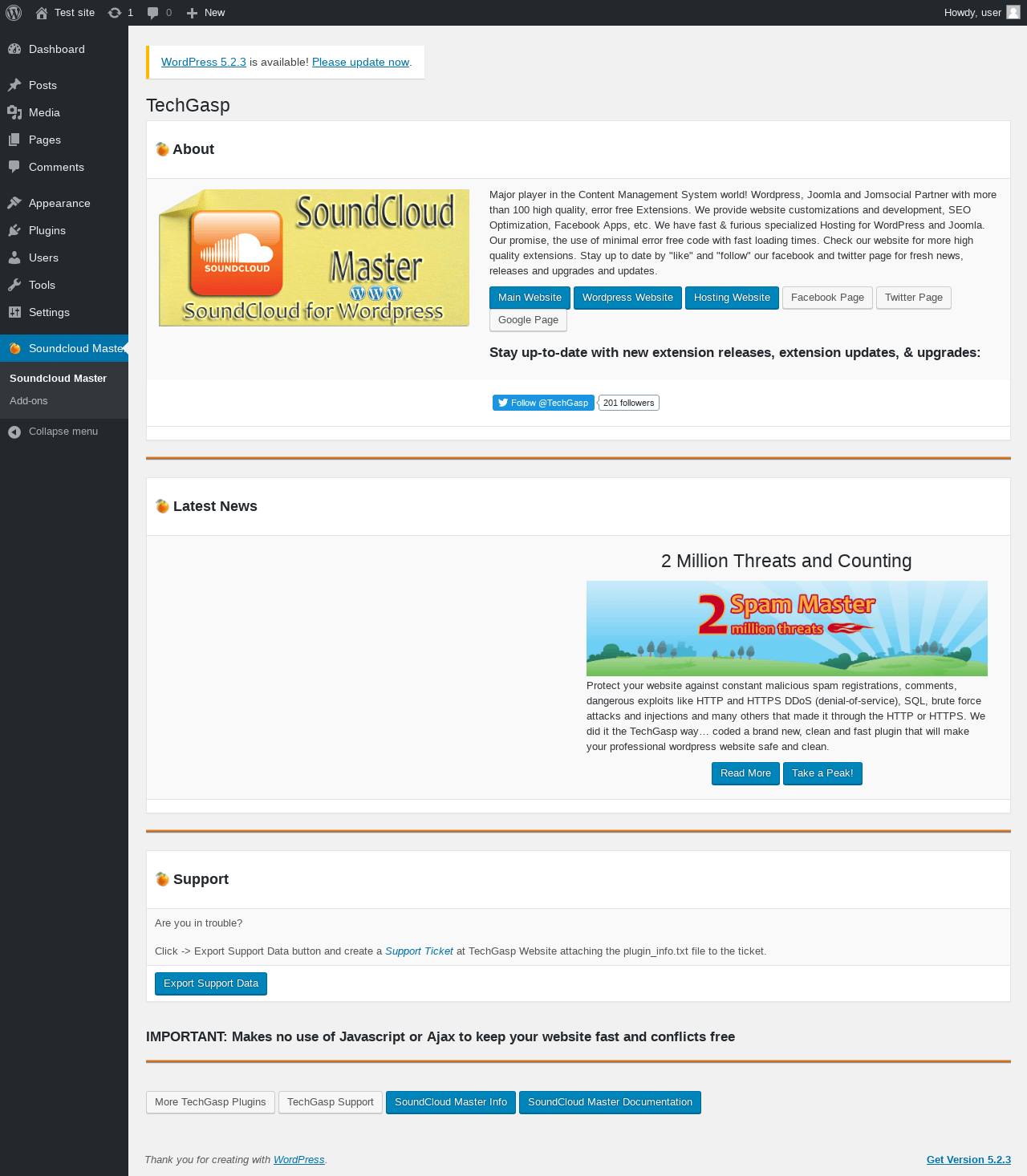 Does TechGasp SoundCloud Master work with WordPress 5.2.3 and PHP 7.2.16? A smoke test was performed on .