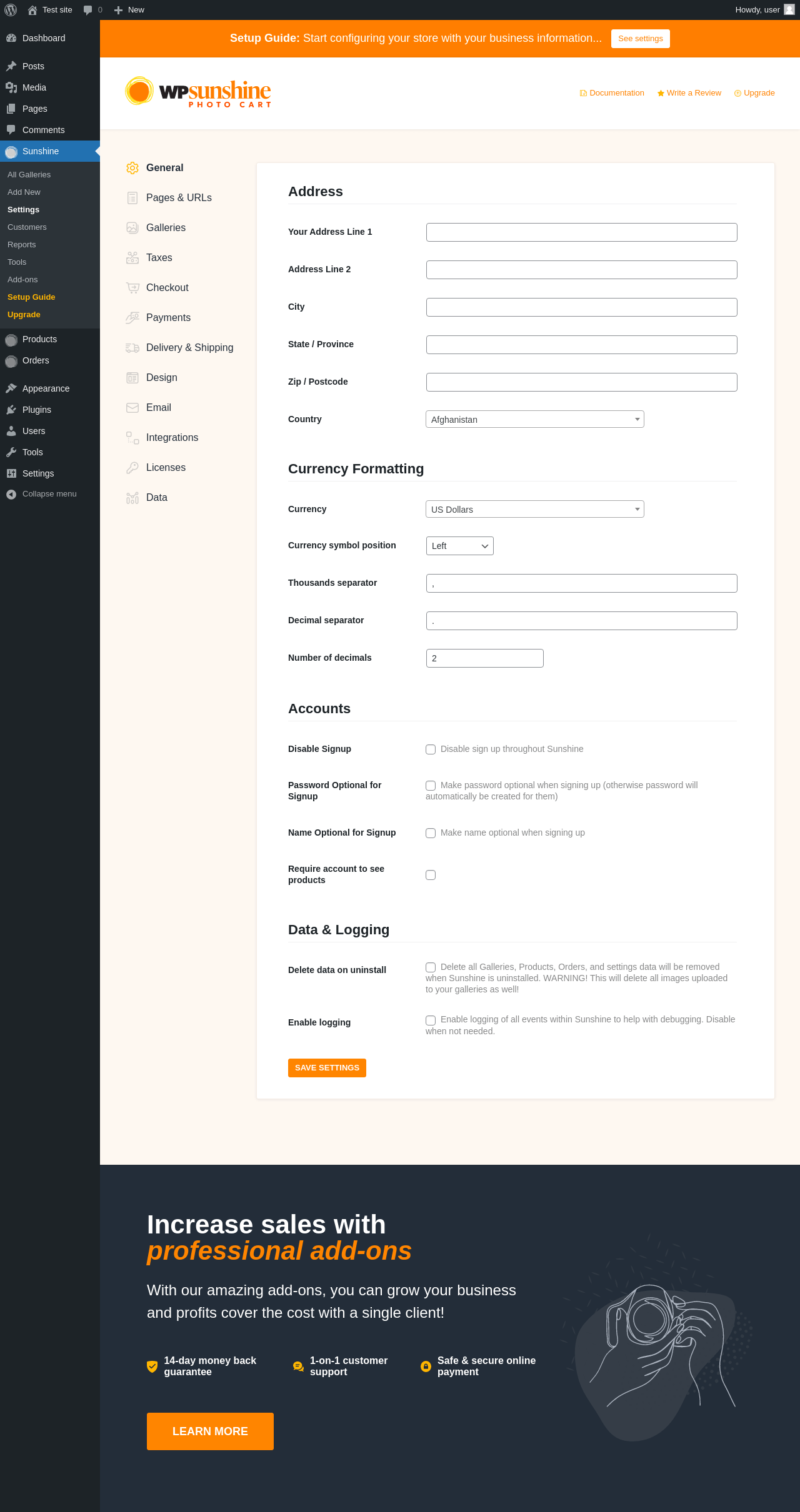 | URL | /wp-admin/edit.php?post_type=sunshine-gallery&page=sunshine-addons |