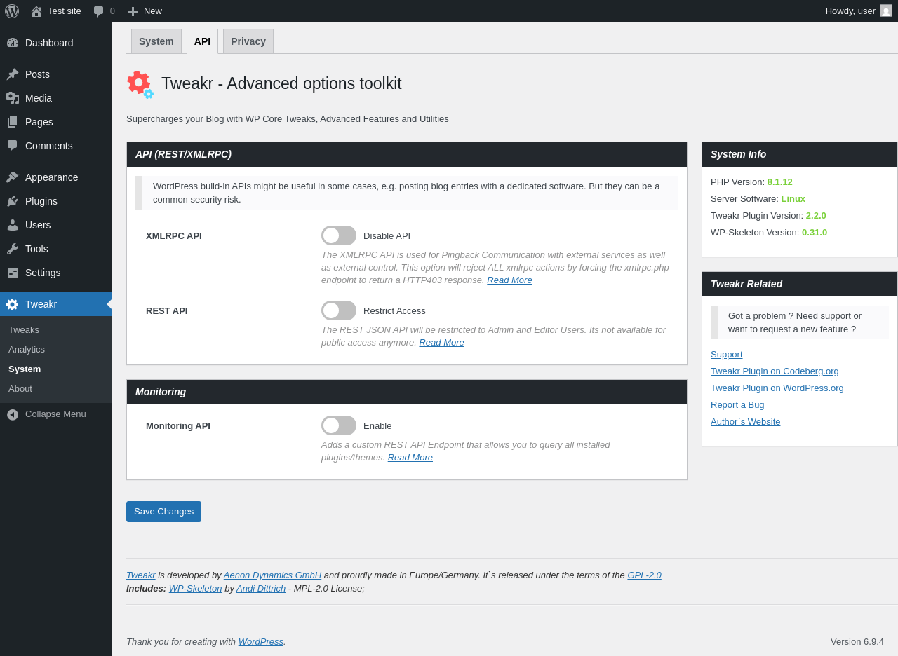 | URL | /wp-admin/admin.php?page=tweakr-system |