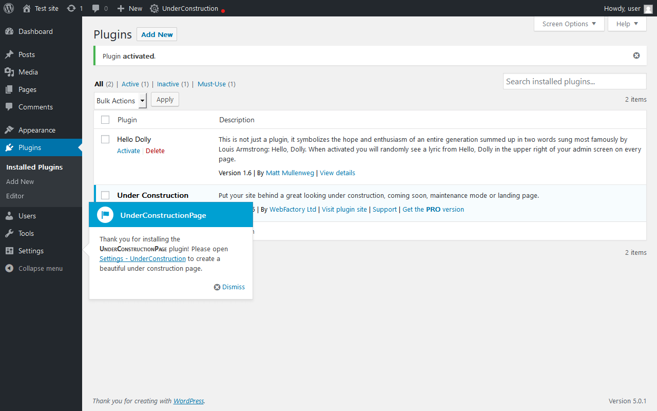 Does Under Construction work with WordPress 5.0.1 and PHP 7.0.16? A smoke test was performed on .