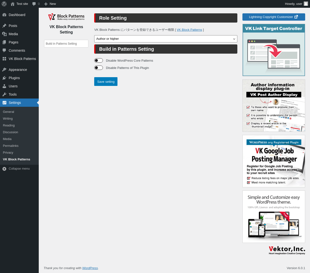 | URL | /wp-admin/options-general.php?page=vk_block_patterns_options |