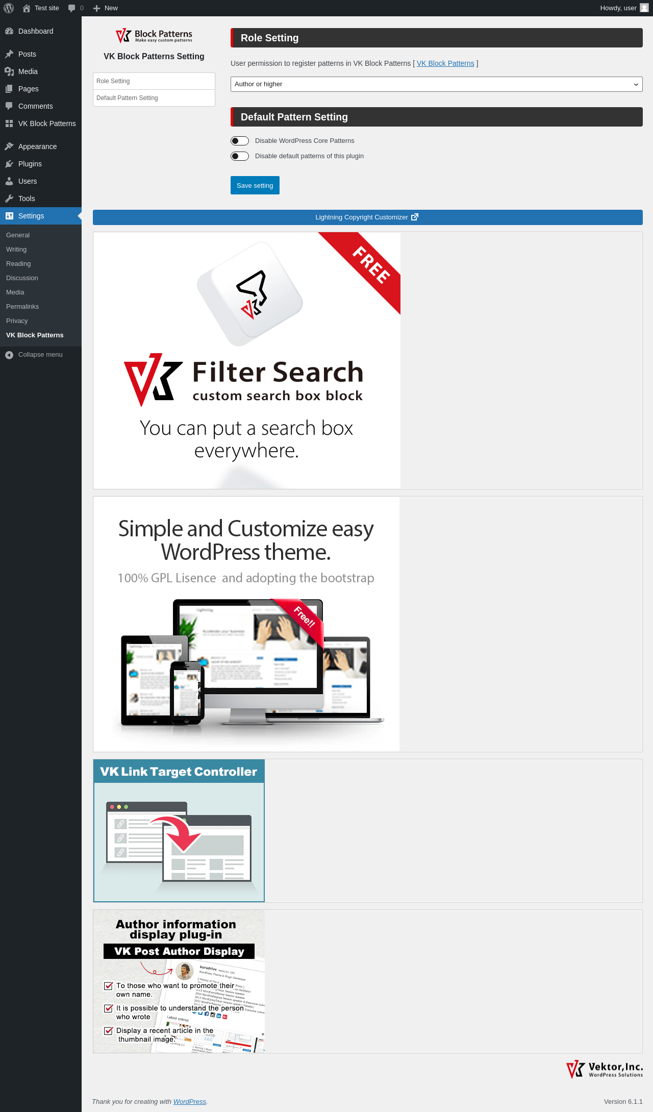 | URL | /wp-admin/options-general.php?page=vk_block_patterns_options |