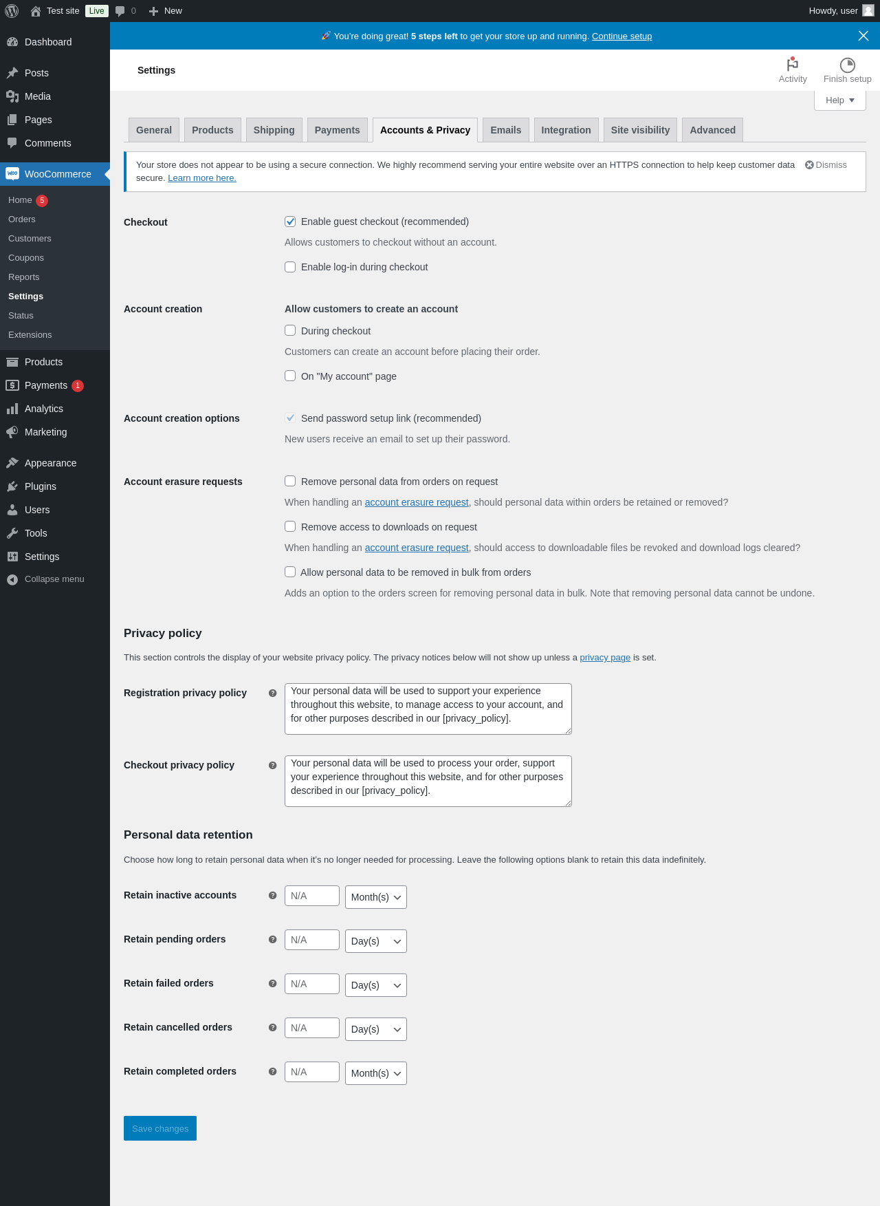 WooCommerce → Settings → Accounts & Privacy