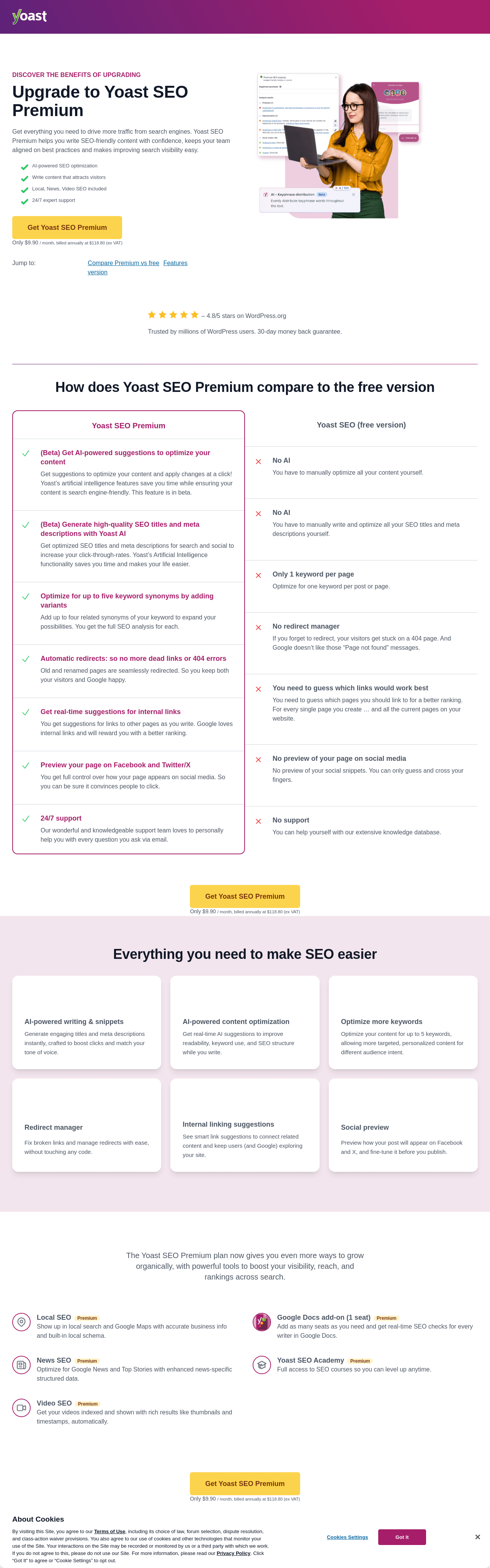 | URL | https://yoast.com/reasons-to-upgrade/?days_active=0&navigation_page=main-menu&php_version=8.1&platform=wordpress&platform_version=6.9&screen=wpseo_upgrade_sidebar&shortlink=wordpress-menu-upgrade-premium&software=free&software_version=26.6&utm_campaign=evergreen&utm_content=upgrade-button&utm_medium=software&utm_source=yoast-seo-free&utm_term=upsell |