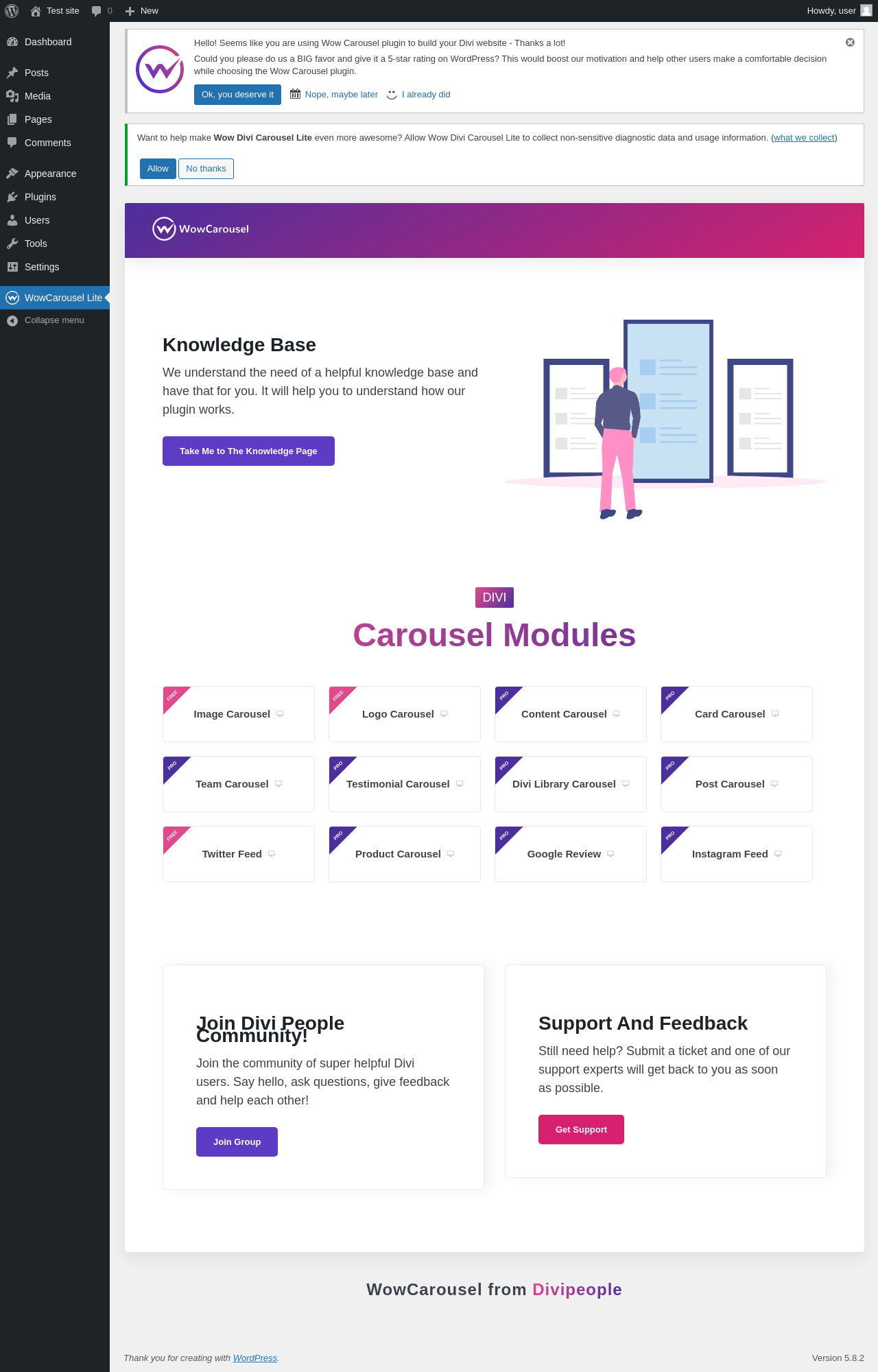 Does WowCarousel for Divi Lite work with WordPress 5.8.2 and PHP 7.4.8? A smoke test was performed on .